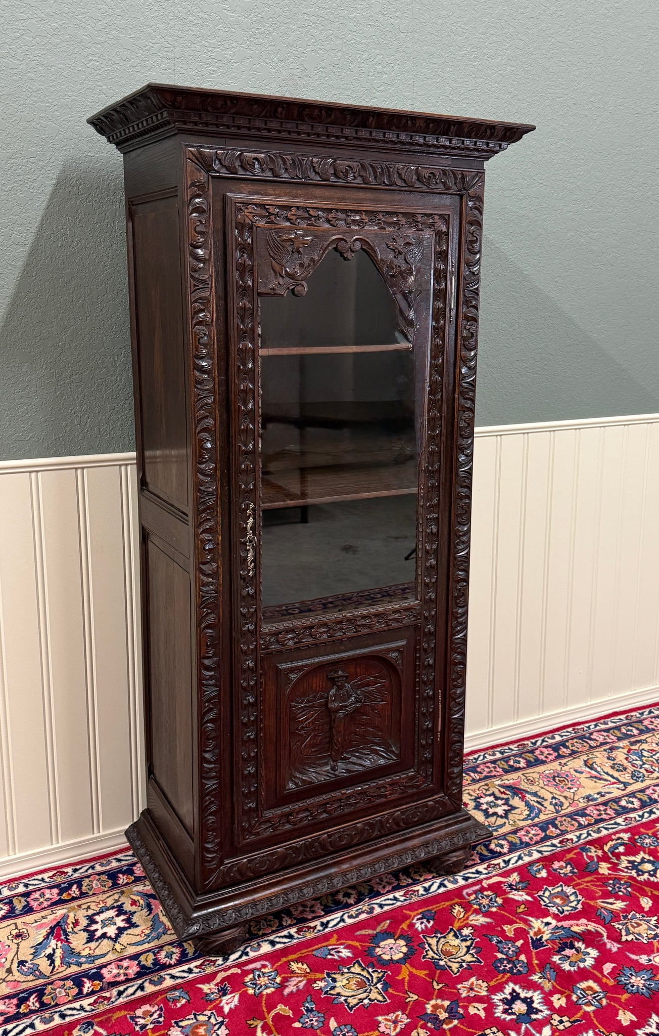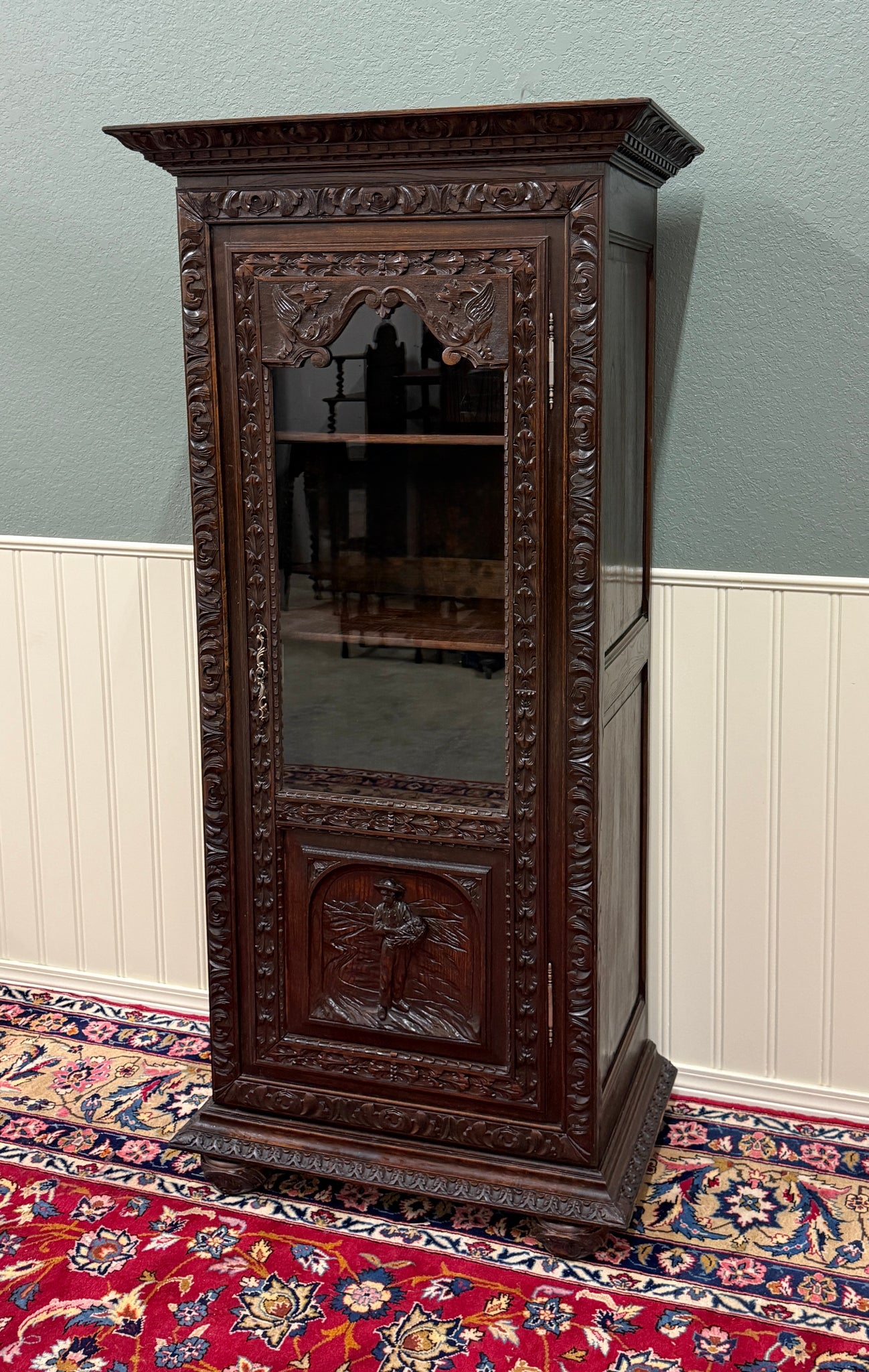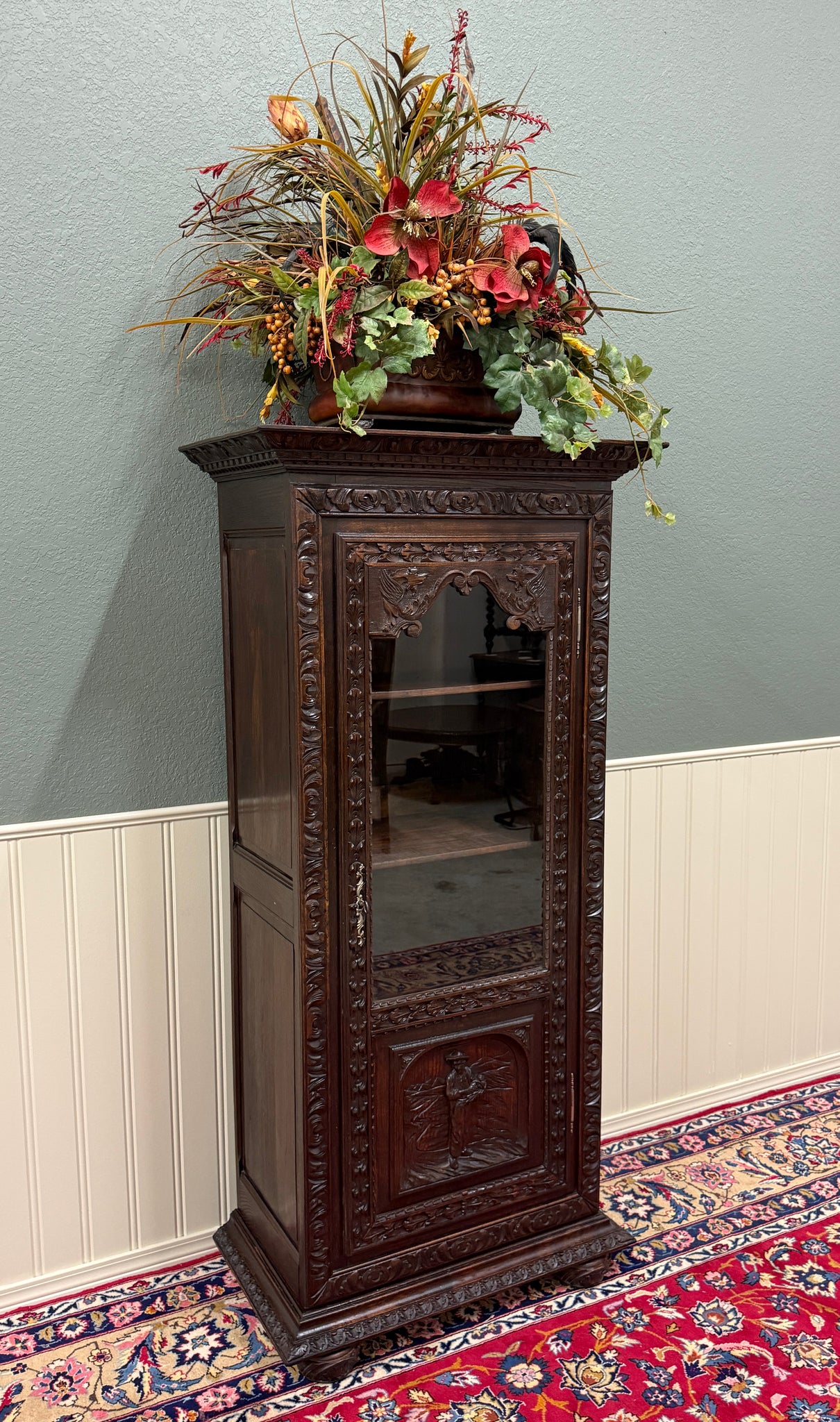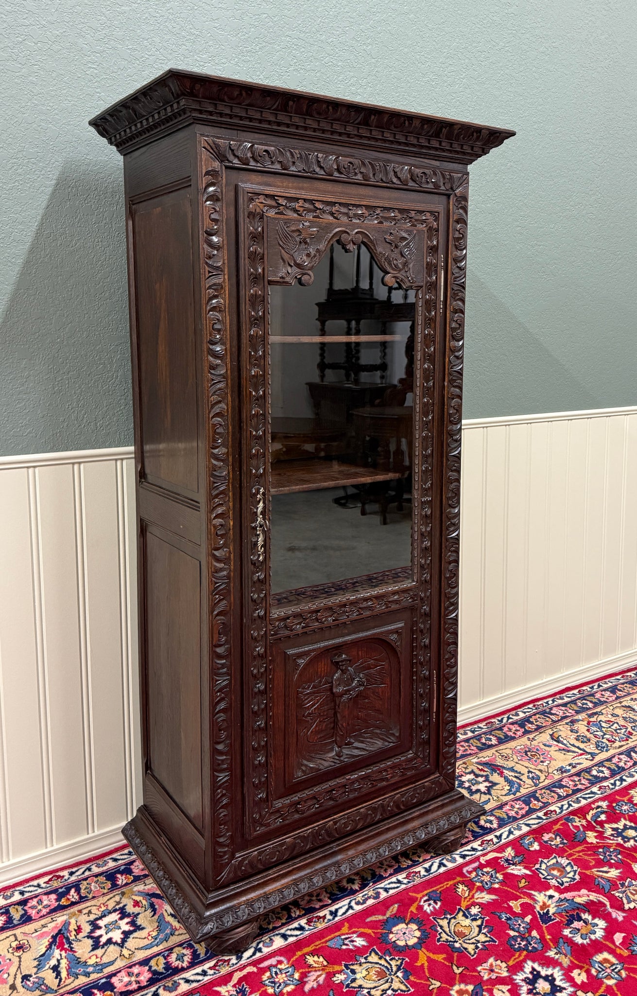 Beautifully Carved Antique French Chestnut Breton Bookcase Armoire Bonnetiere Linen Cabinet with Wavy Glass Door~~c. 1890s