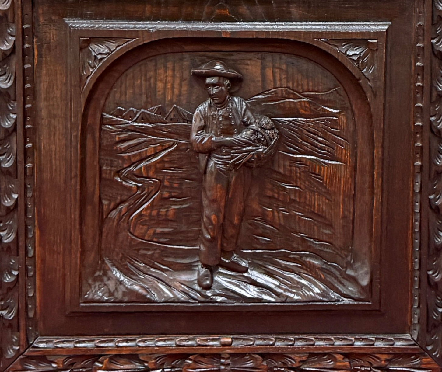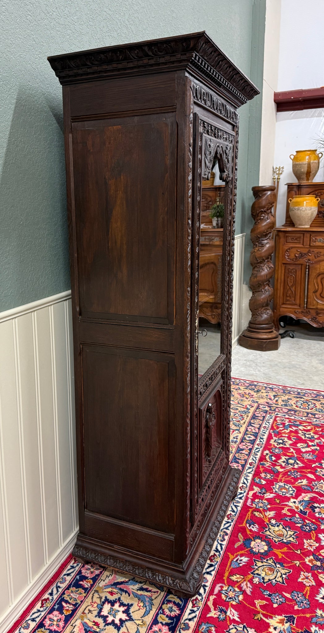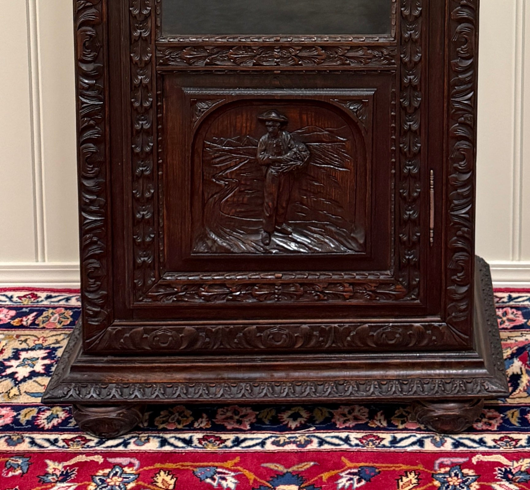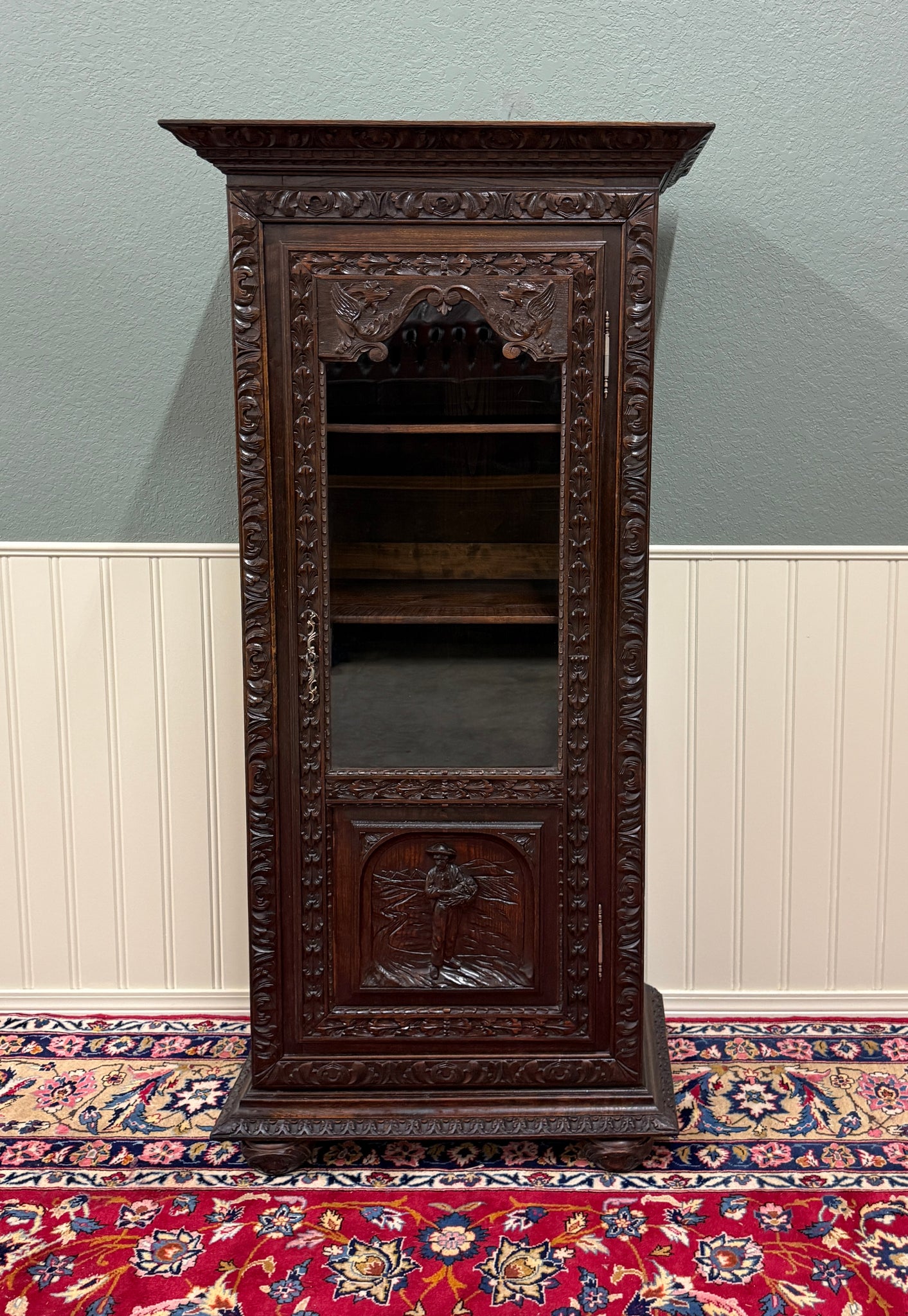 Beautifully Carved Antique French Chestnut Breton Bookcase Armoire Bonnetiere Linen Cabinet with Wavy Glass Door~~c. 1890s