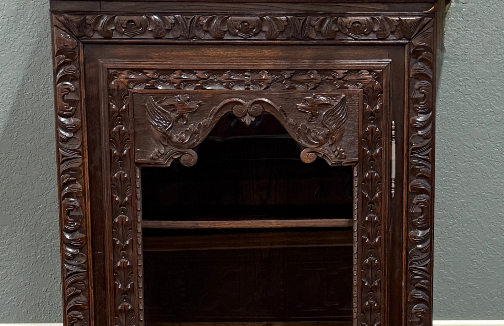 Heavy, sturdy and stable with beautiful carved front and paneled sides and original wavy glass door~~ rich chestnut patina
