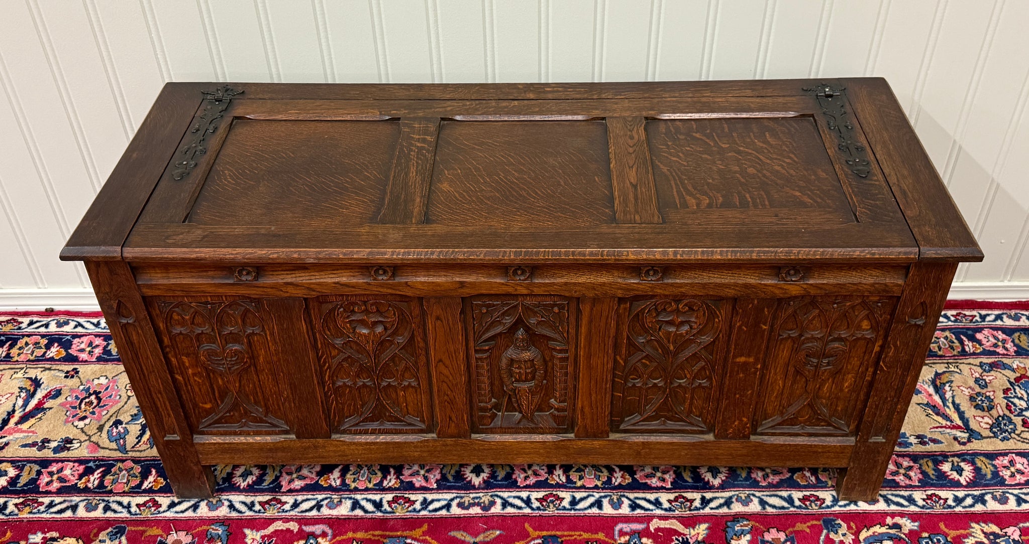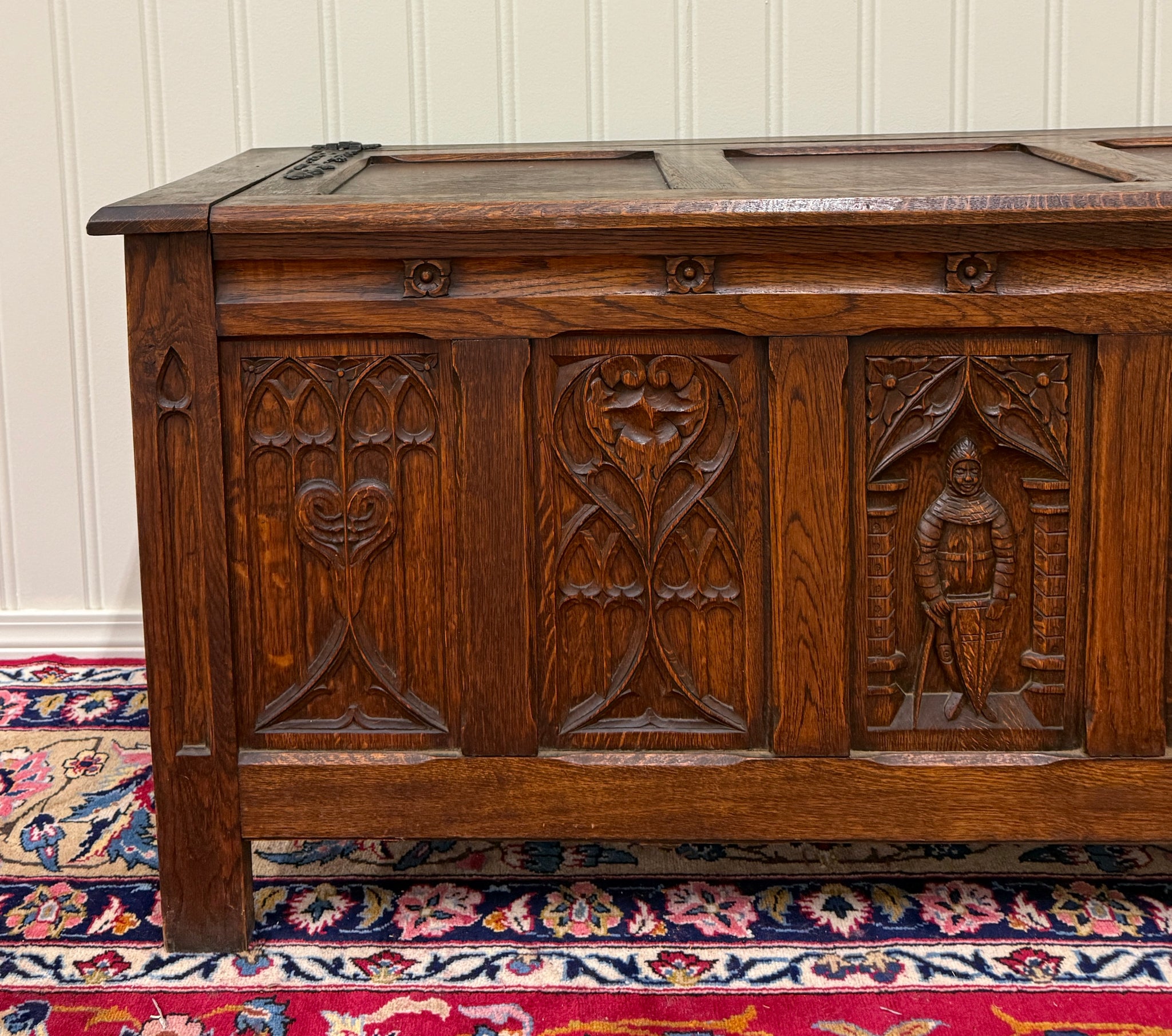 SPECTACULAR gothic design with iron strap hinges~~ paneled sides, Gothic tracery, heraldic shields, coat of arms and knight