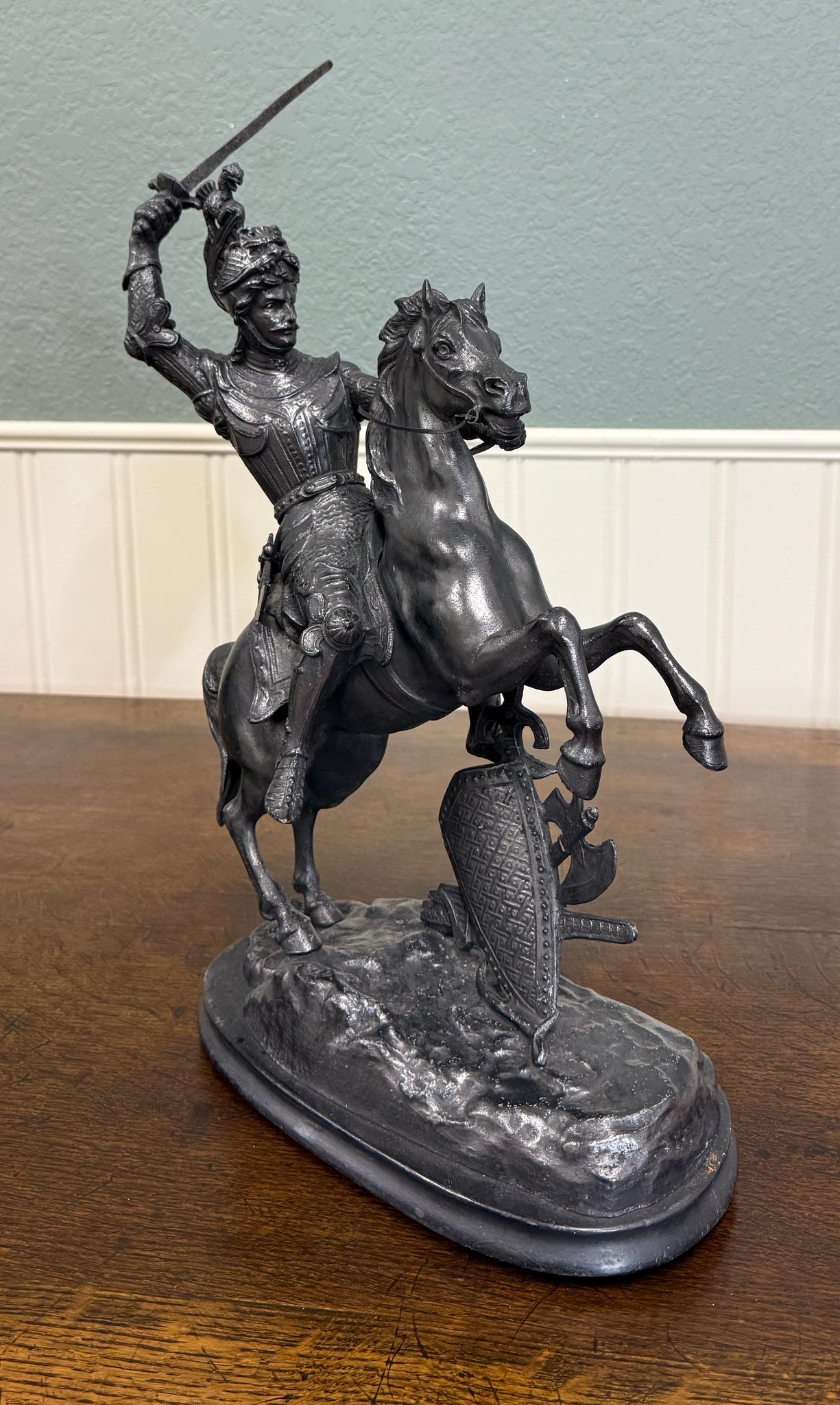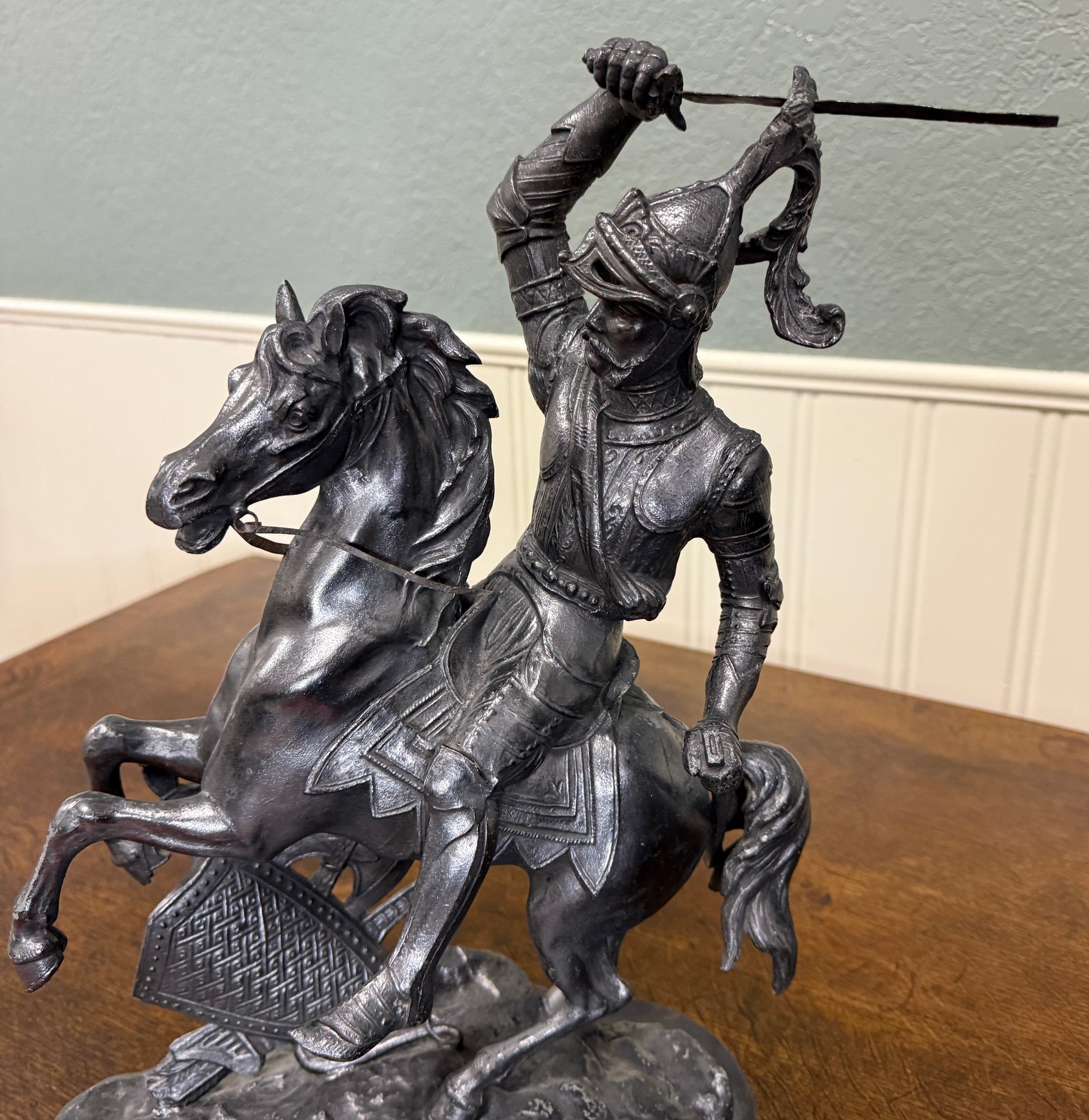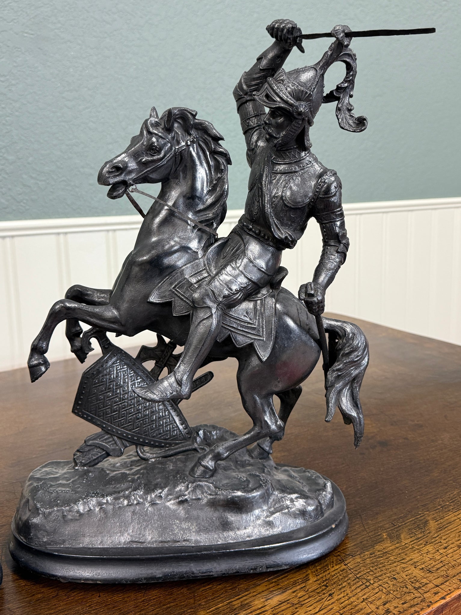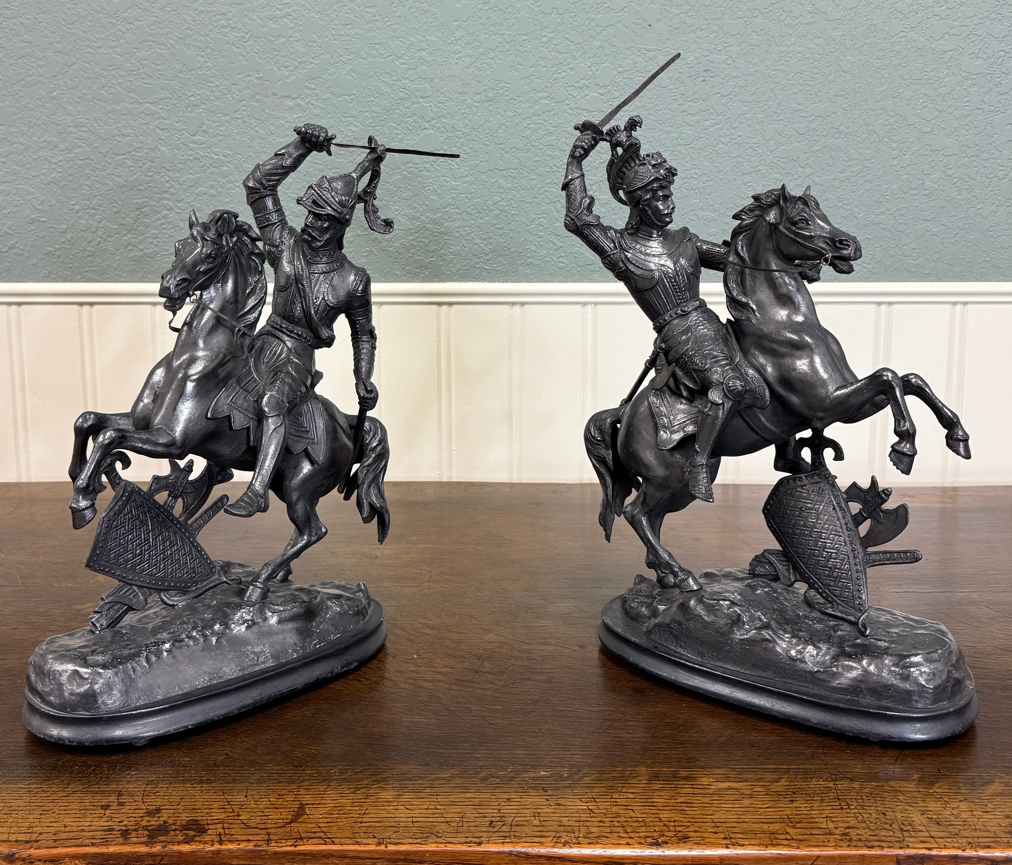 EXQUISITE Antique French Pair of Patinated Spelter Sculptures of Knights on Horseback