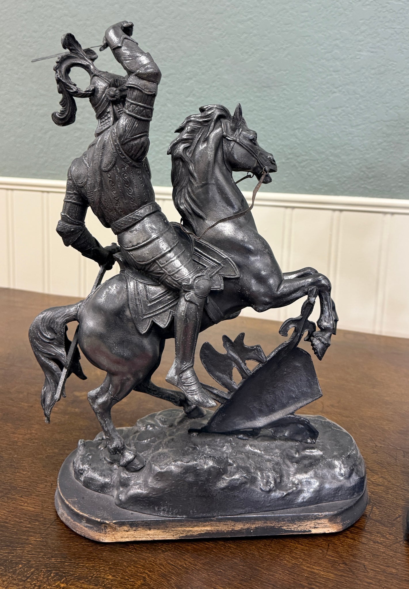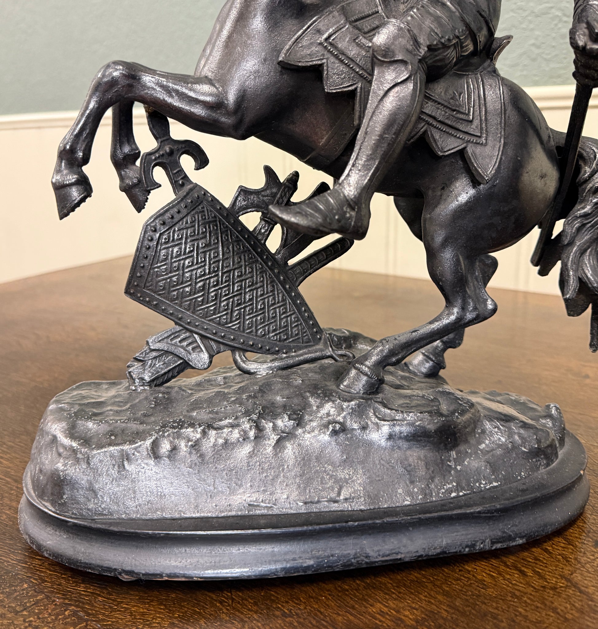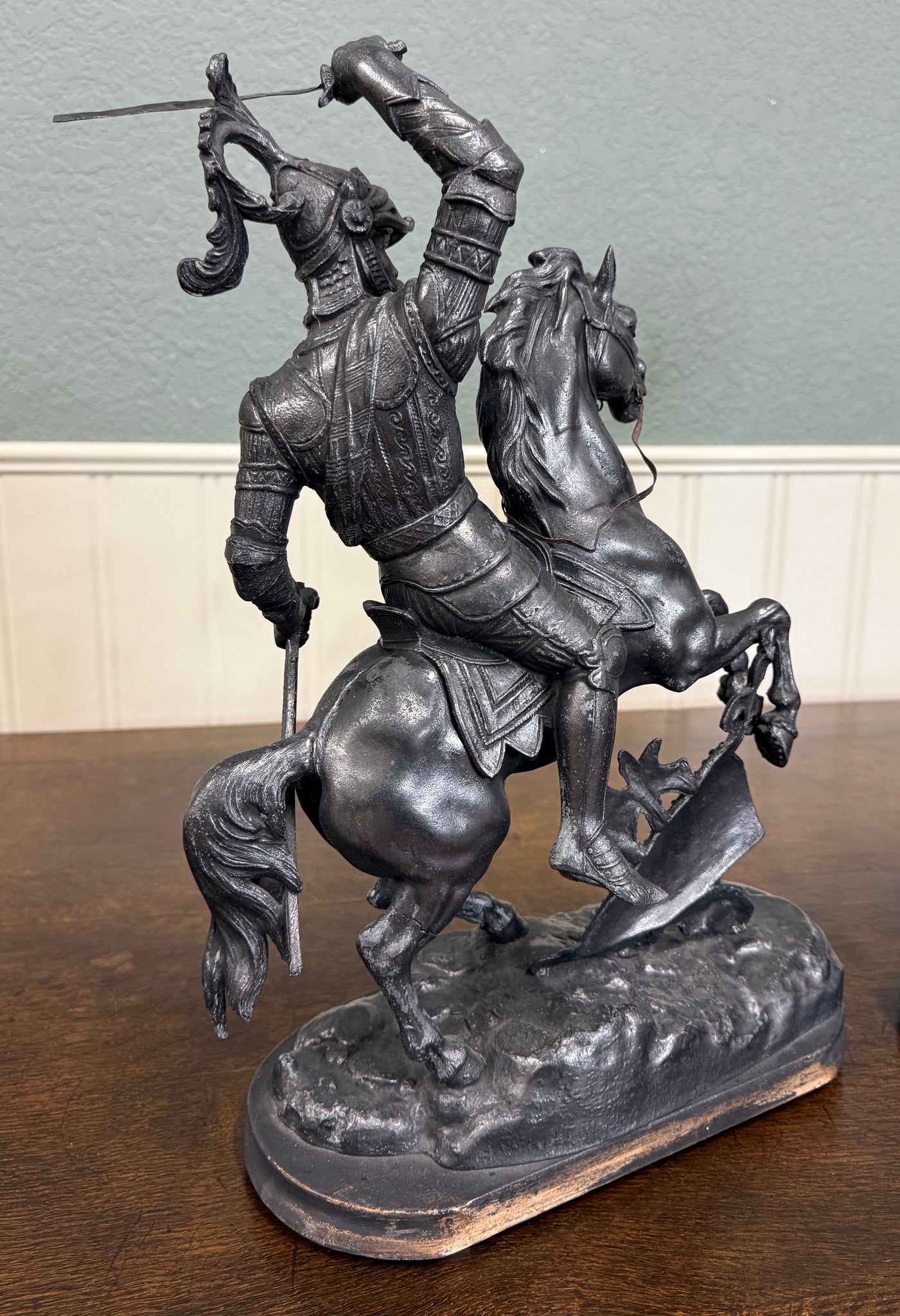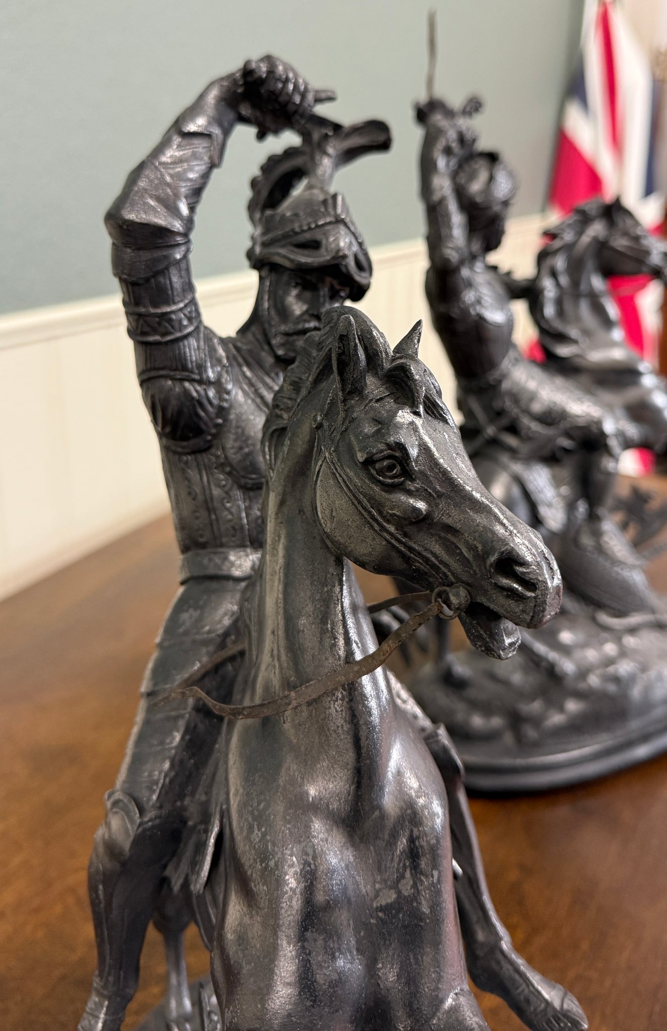 EXQUISITE Antique French Pair of Patinated Spelter Sculptures of Knights on Horseback