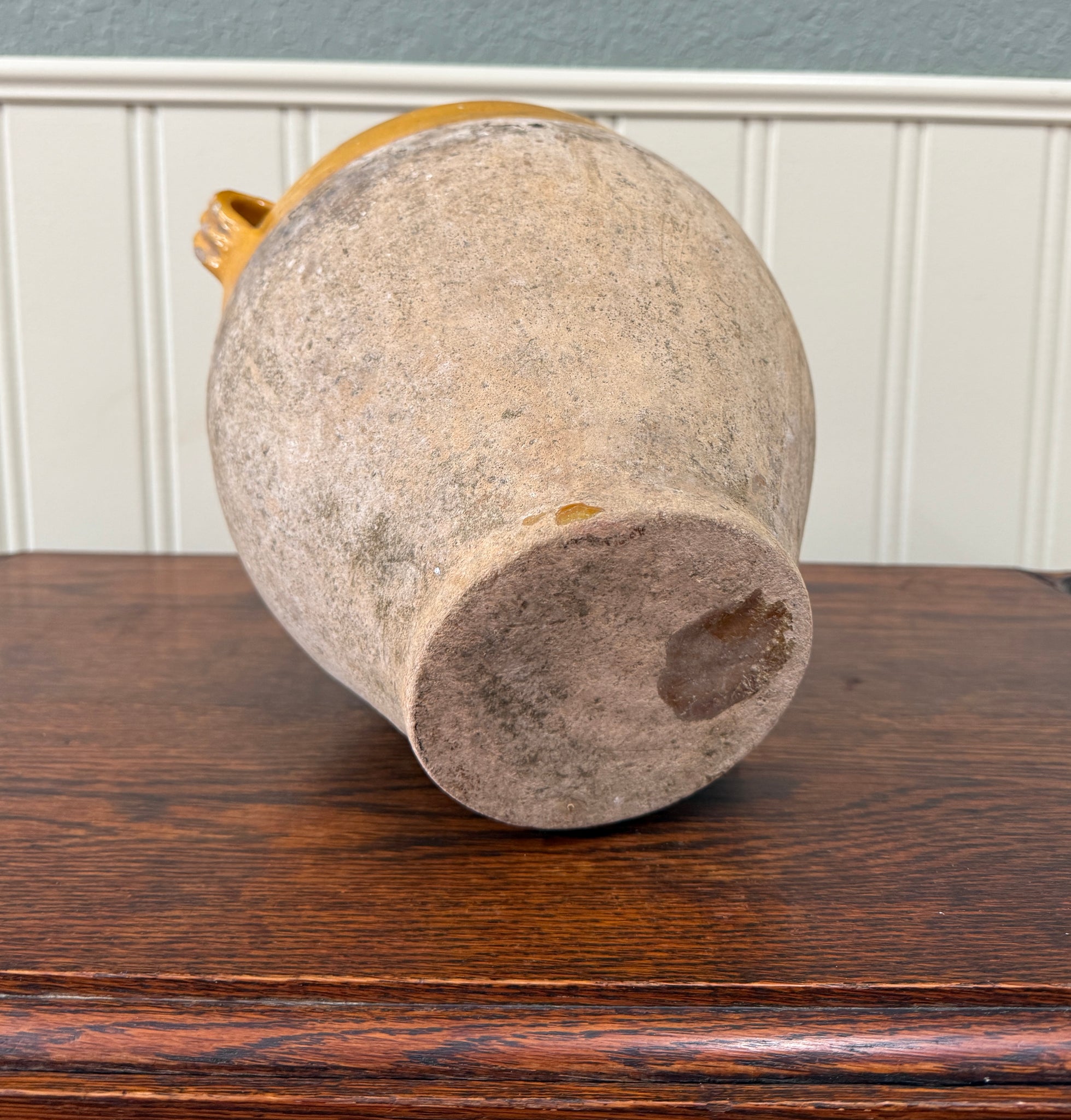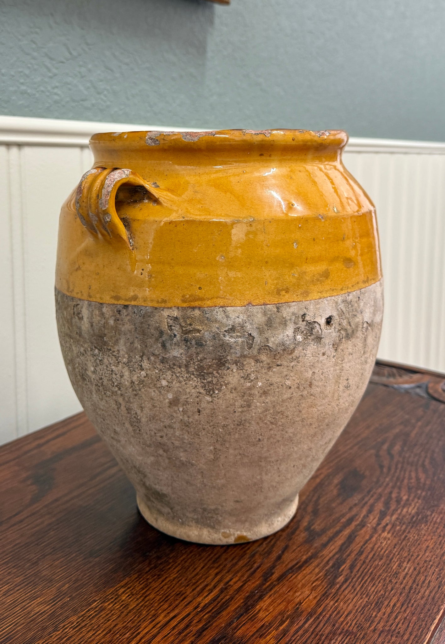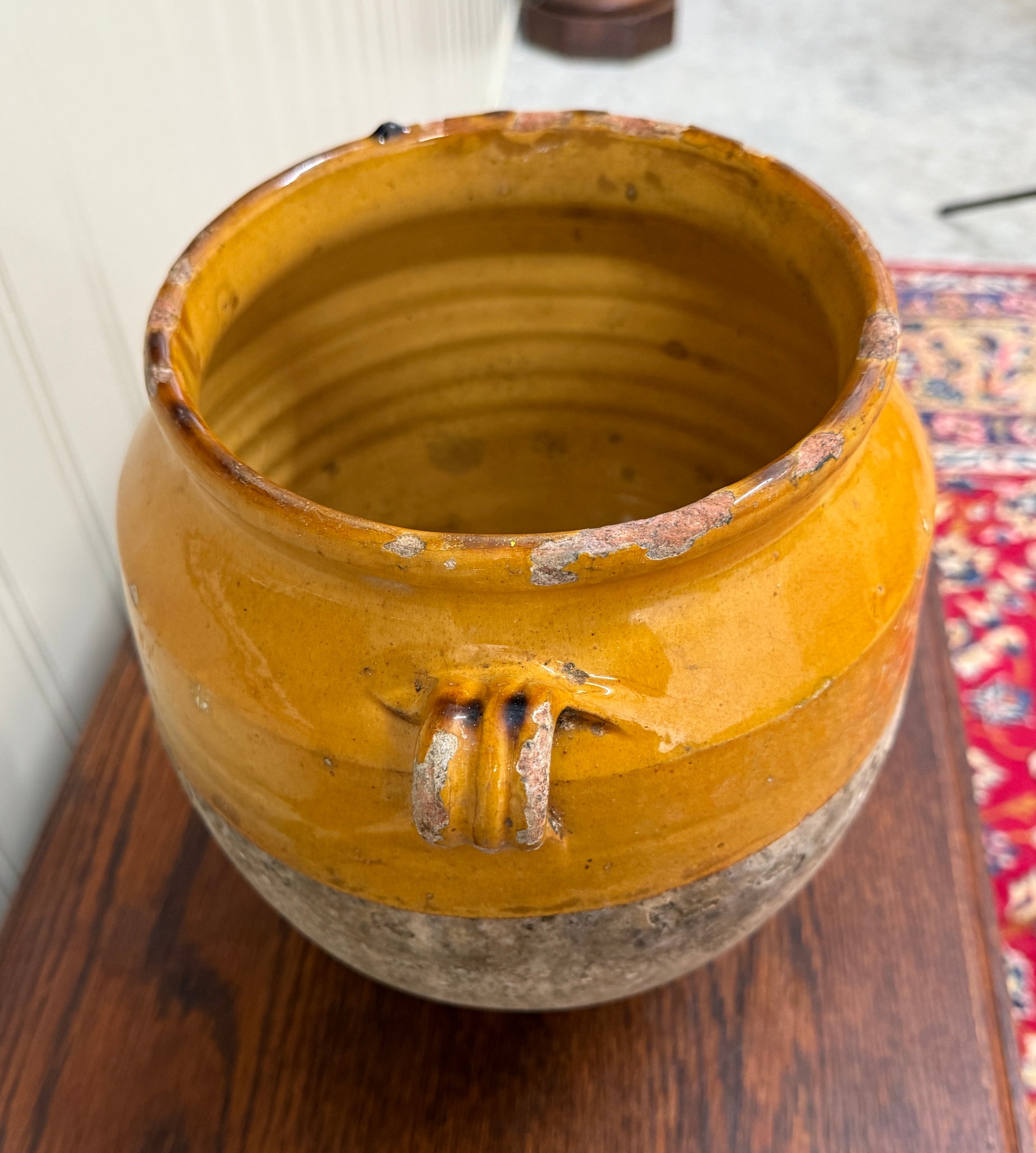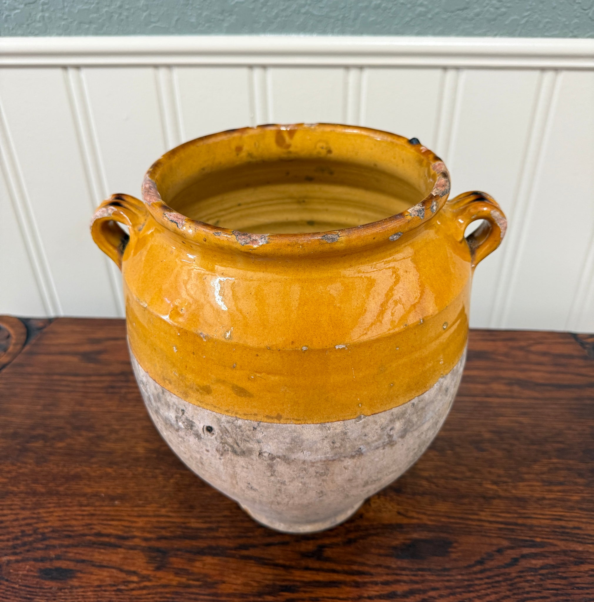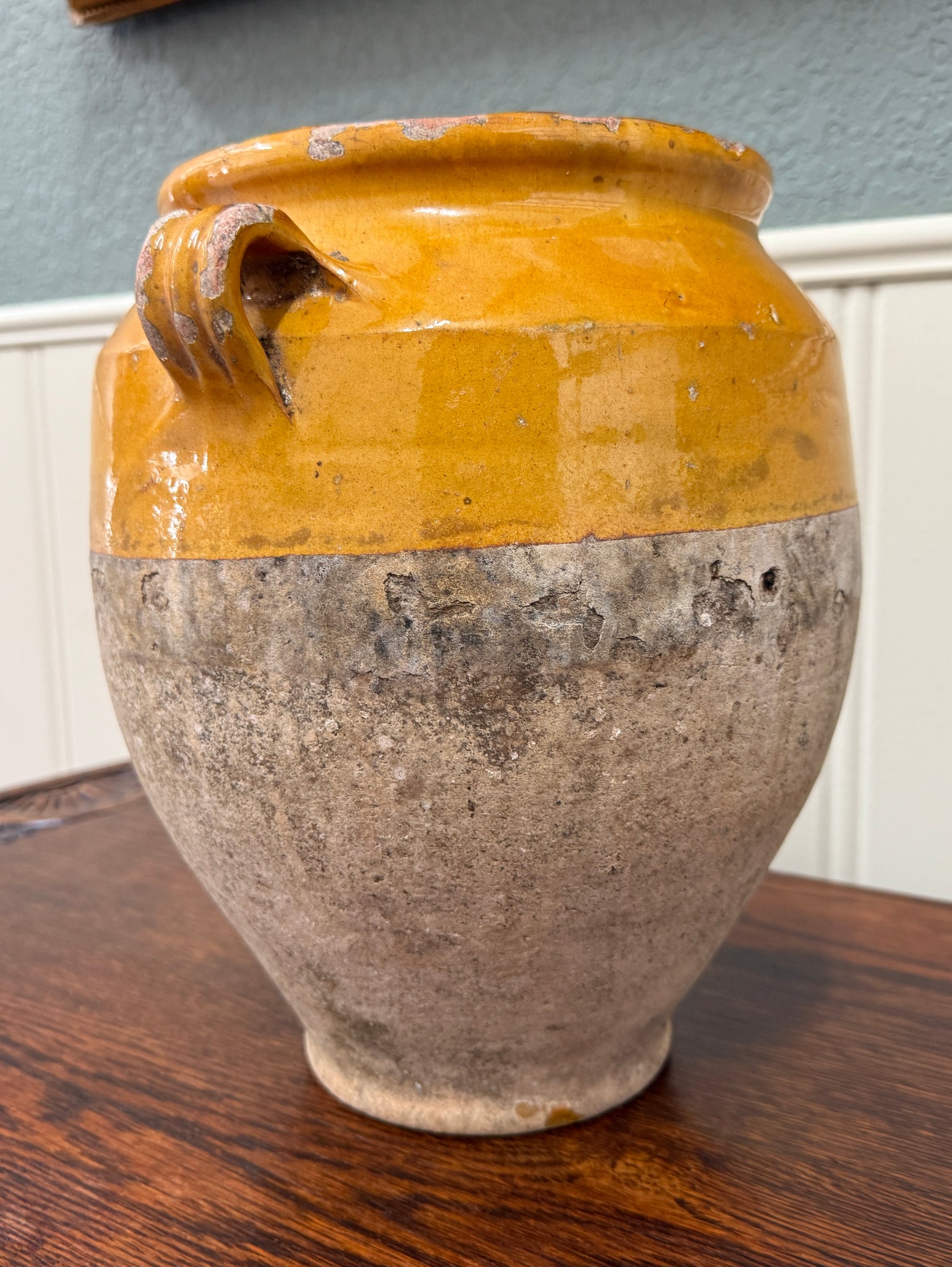 Striking 19th century confit pot directly from the south of France~~eye-catching yellow ochre glazing from rim to mid-section~~bare clay with nice aged patina on lower section