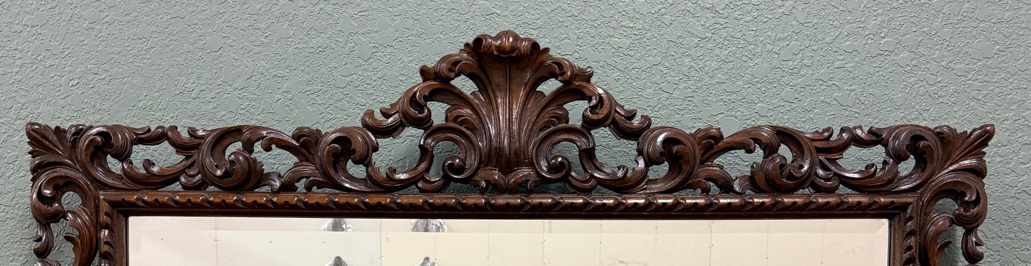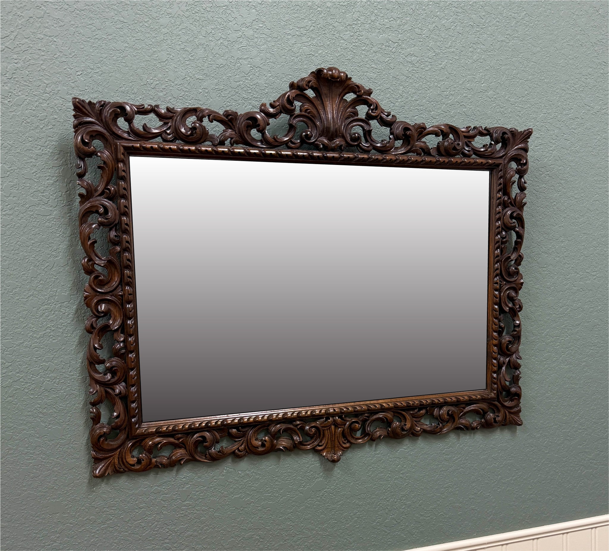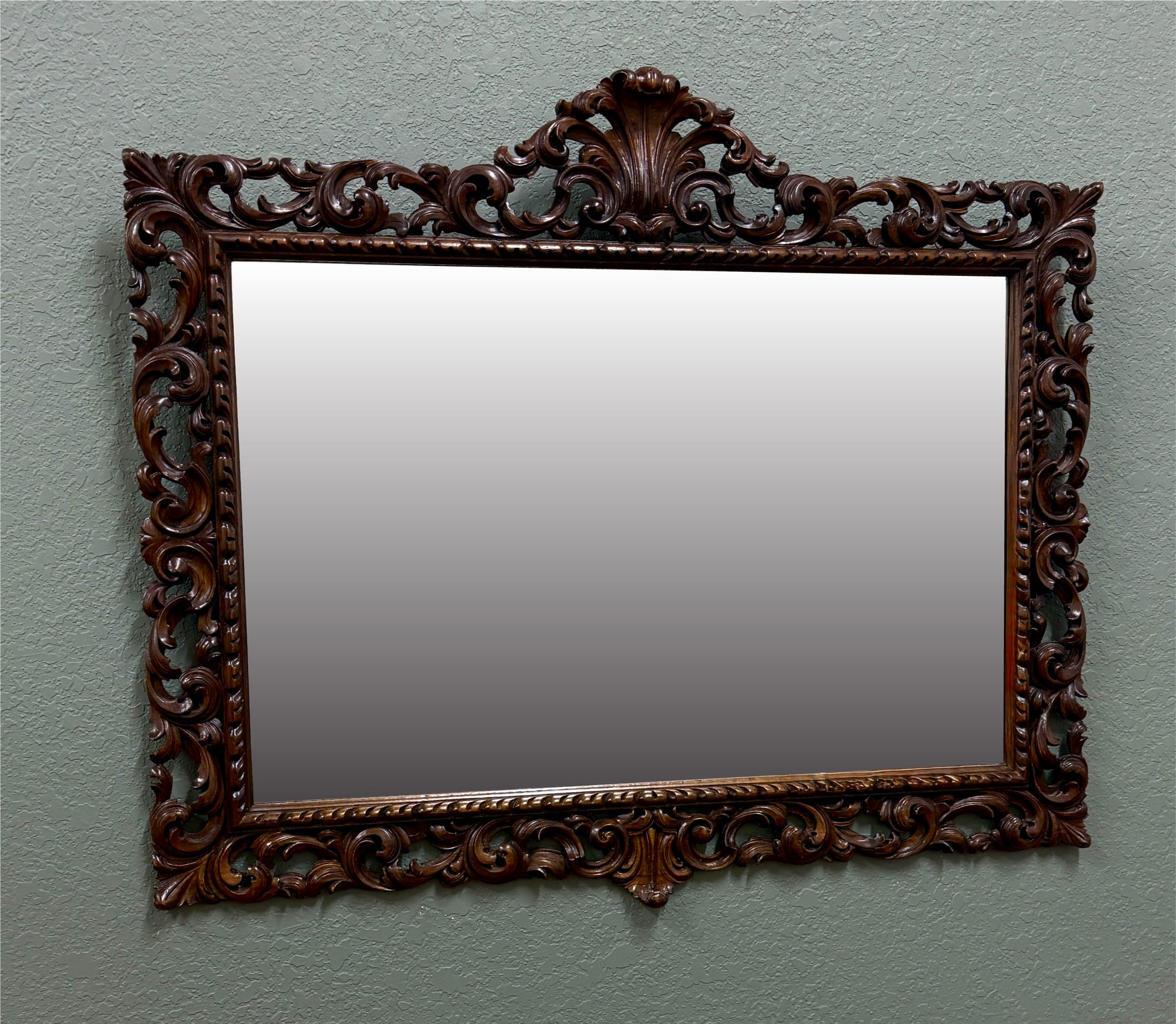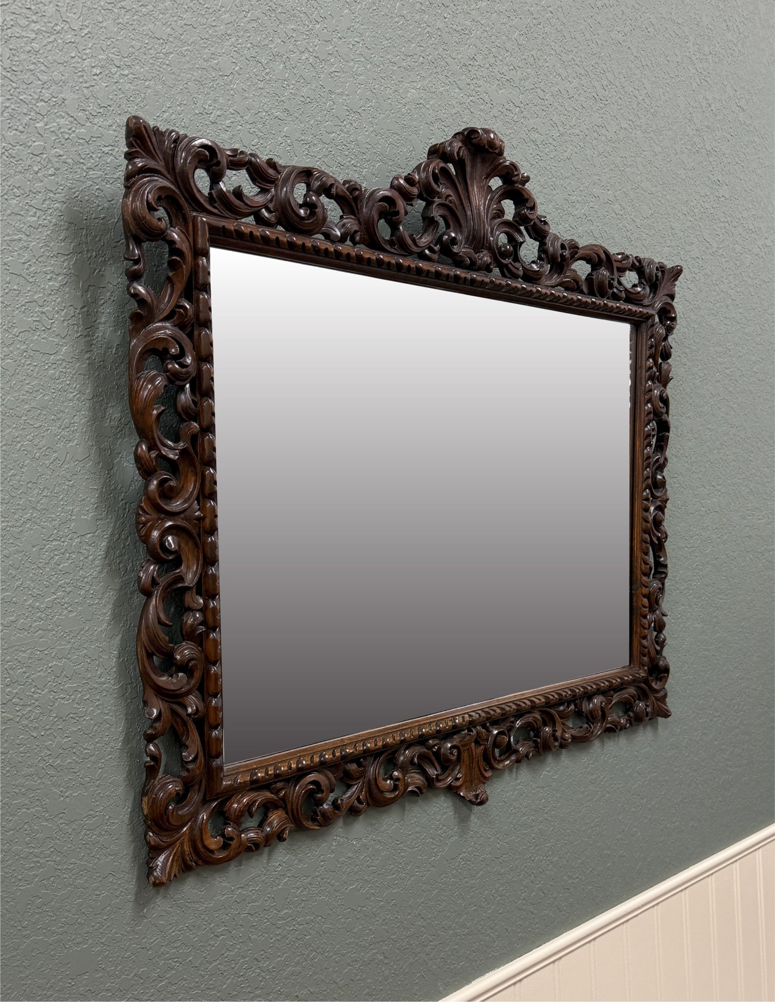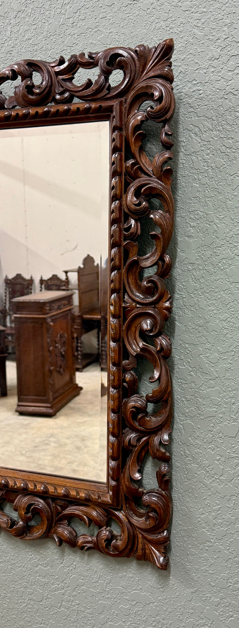 GORGEOUS Antique French Renaissance Revival LARGE Rectangular Framed HIGHLY CARVED Oak Beveled Wall Mirror~~c. early 1900sPopular classic French hanging wall mirror~~beautifully carved with beveled mirror and wood back~~perfect for an entry hall, living area, study, office, library, bedroom, powder room or just about any room in your home or officeVersatile sizeFrame is 36"x 43.5" x 2"