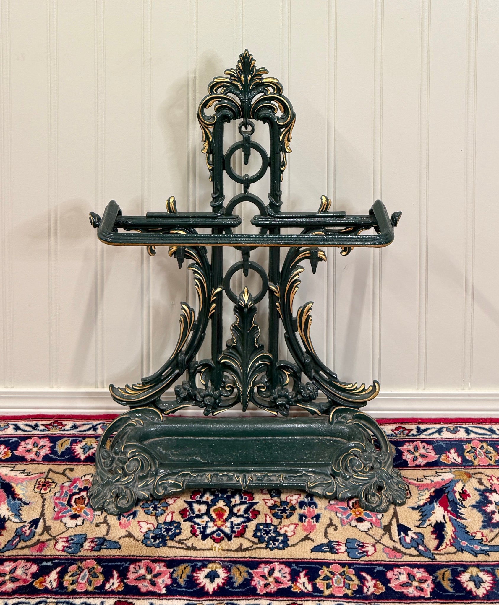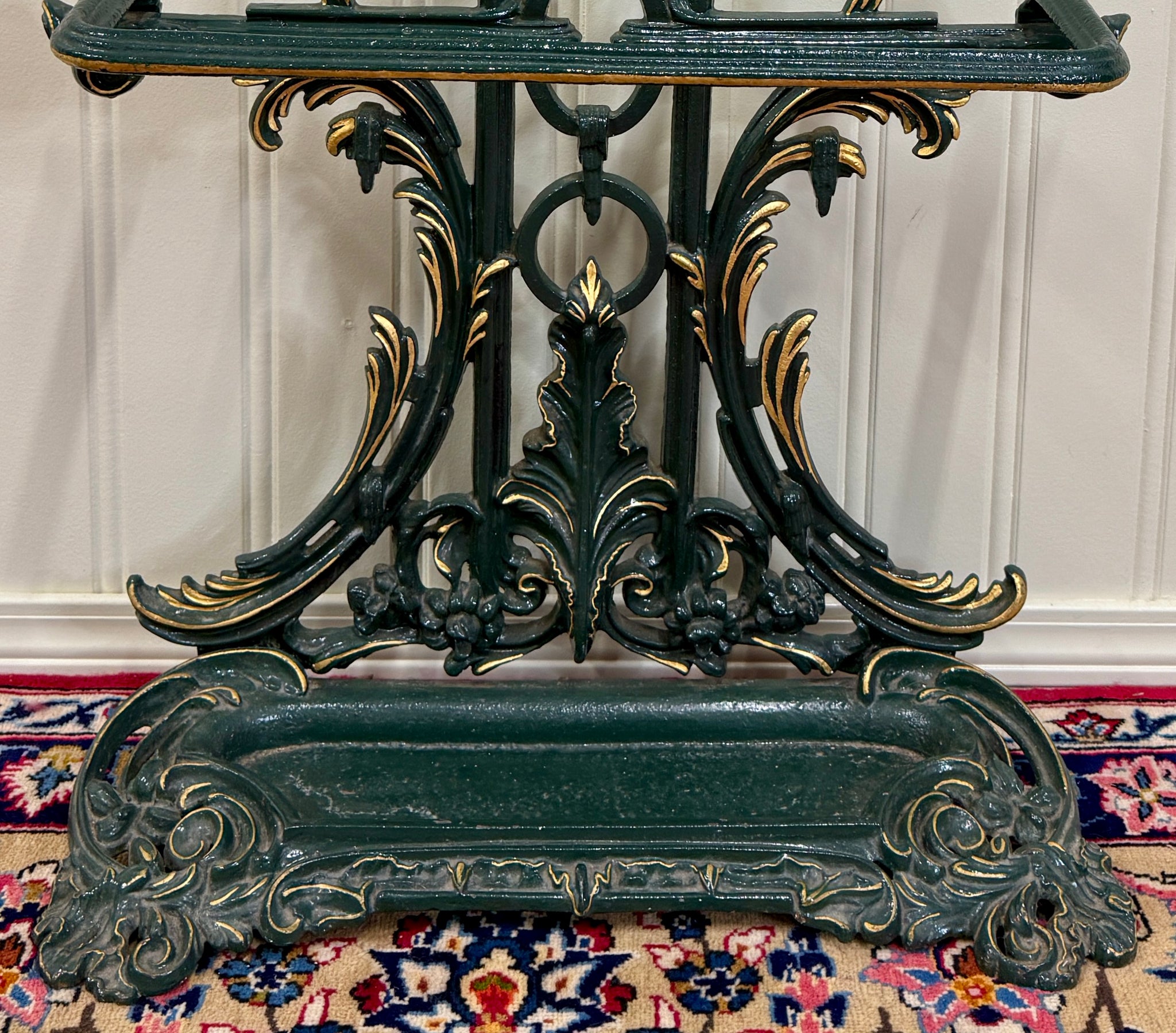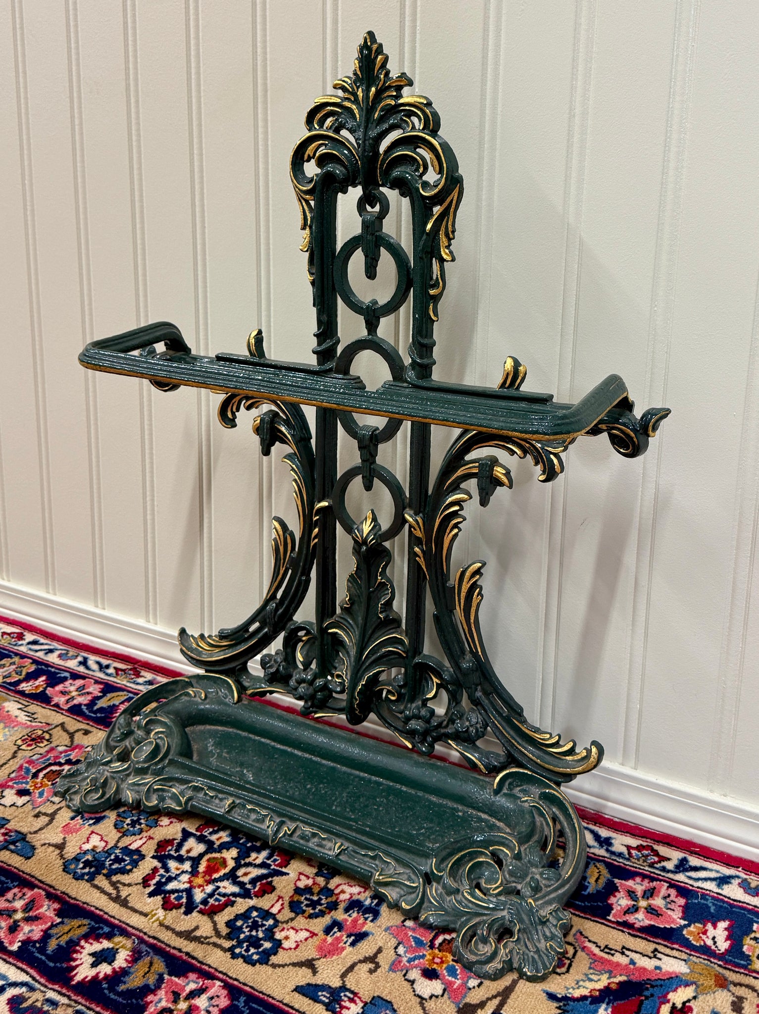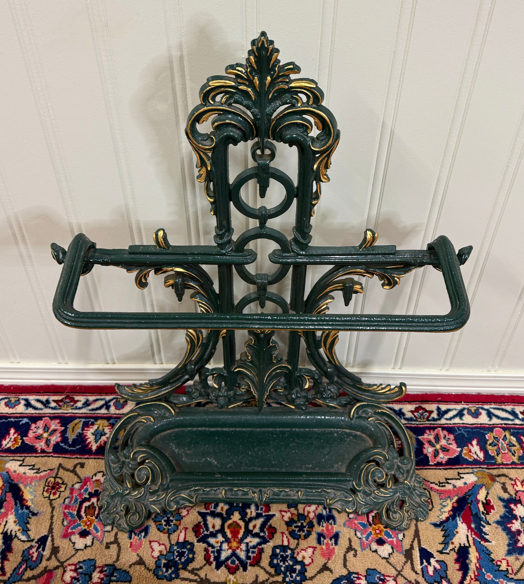 Antique English Cast Iron Gilt and Painted Umbrella Stand, Cane or Stick Stand~~c. 1920s Charming antique English cast iron umbrella stand~~perfect for a entry hall or mudroom for umbrellas or canes~~use it as a decorative piece in a game or billiards room or in a hunting or fishing cabin for pool cues or fishing rods Add a touch of British flair to your home Versatile size~~33" tall x 26" wide x 10" deep Direct from England