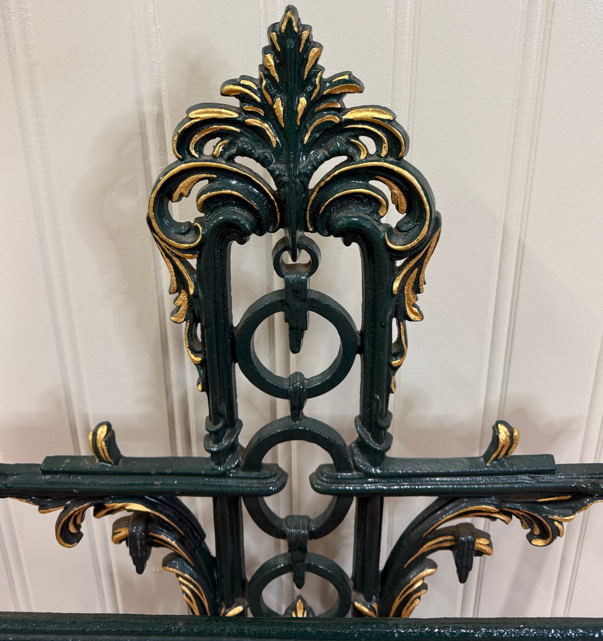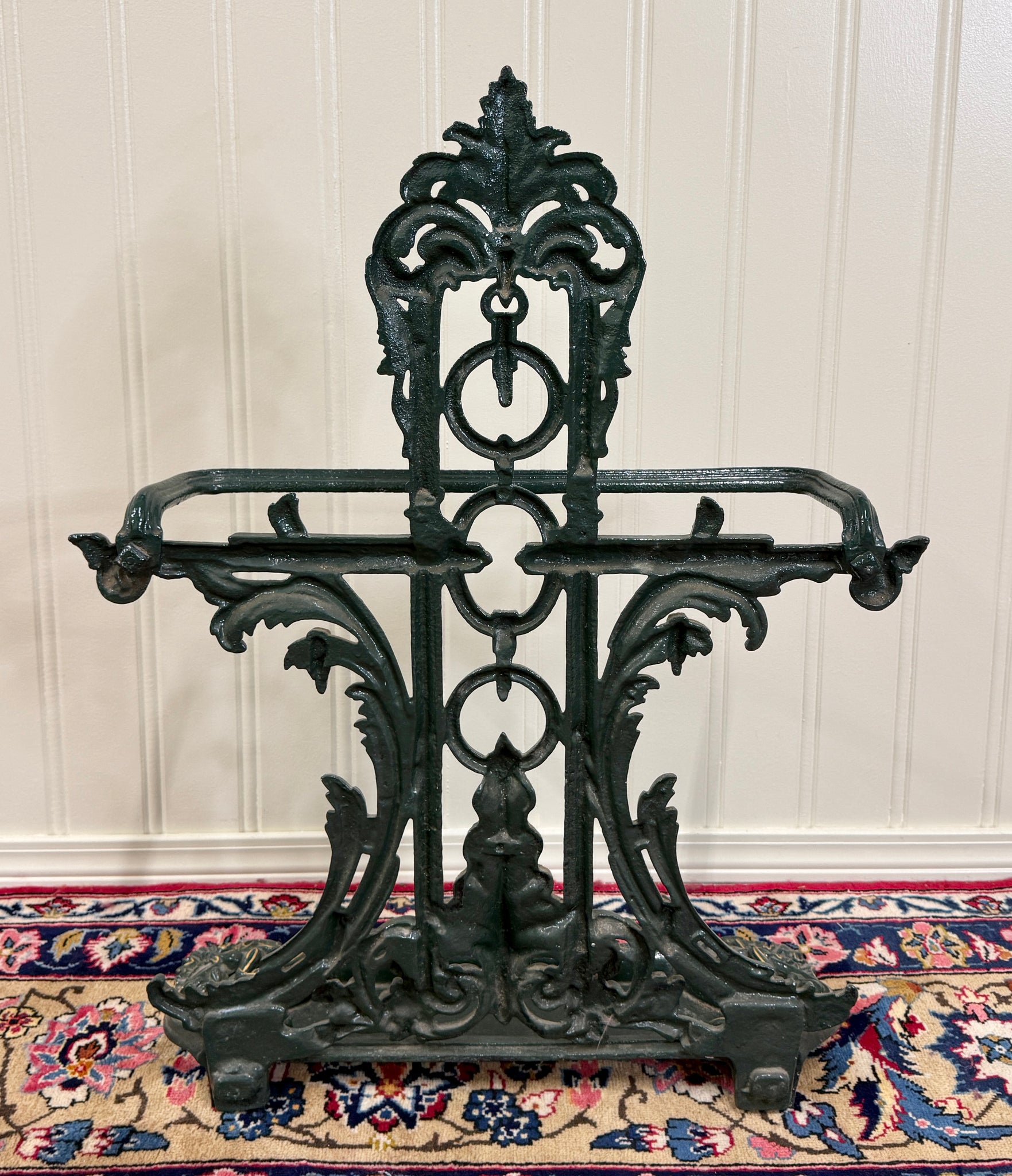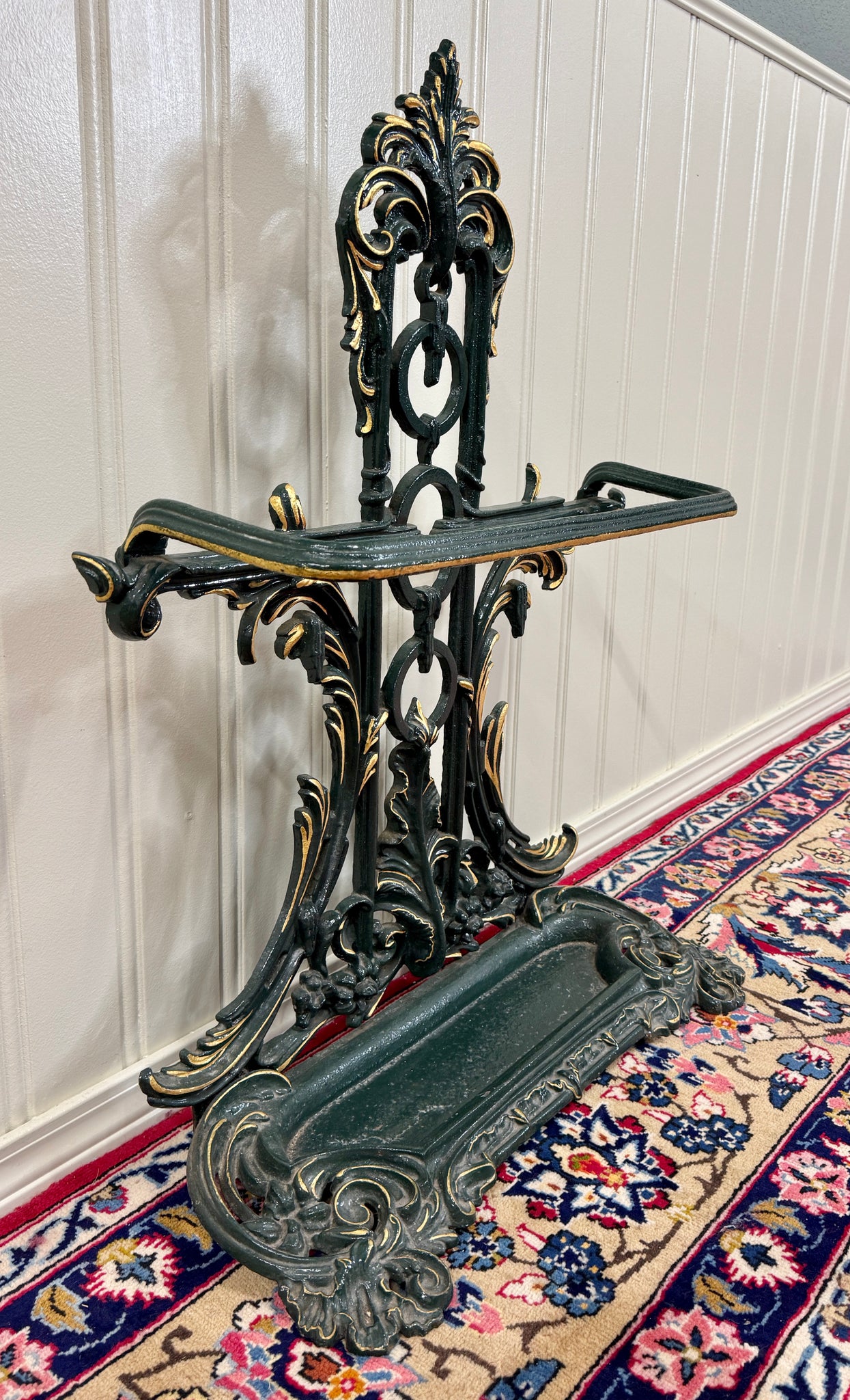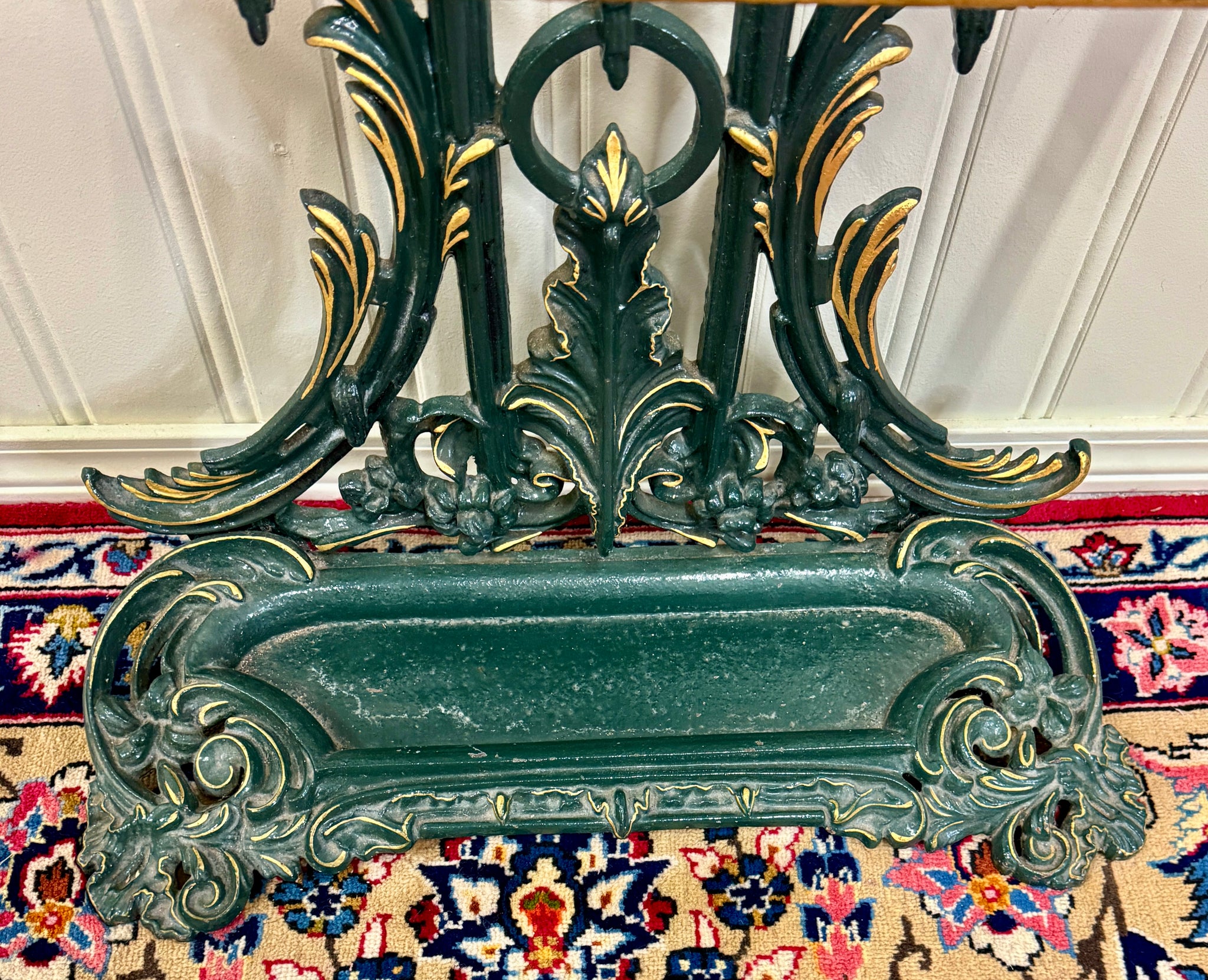 Antique English Cast Iron Gilt and Painted Umbrella Stand, Cane or Stick Stand~~c. 1920s Charming antique English cast iron umbrella stand~~perfect for a entry hall or mudroom for umbrellas or canes~~use it as a decorative piece in a game or billiards room or in a hunting or fishing cabin for pool cues or fishing rods Add a touch of British flair to your home Versatile size~~33" tall x 26" wide x 10" deep Direct from England