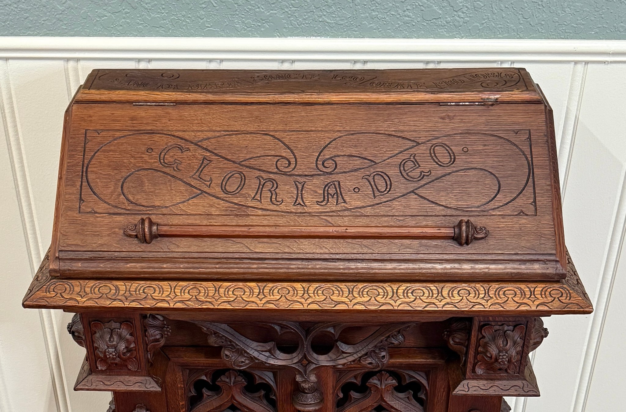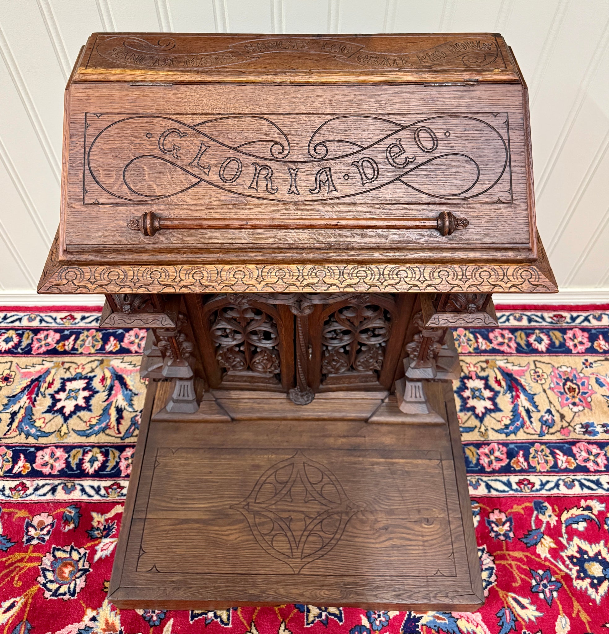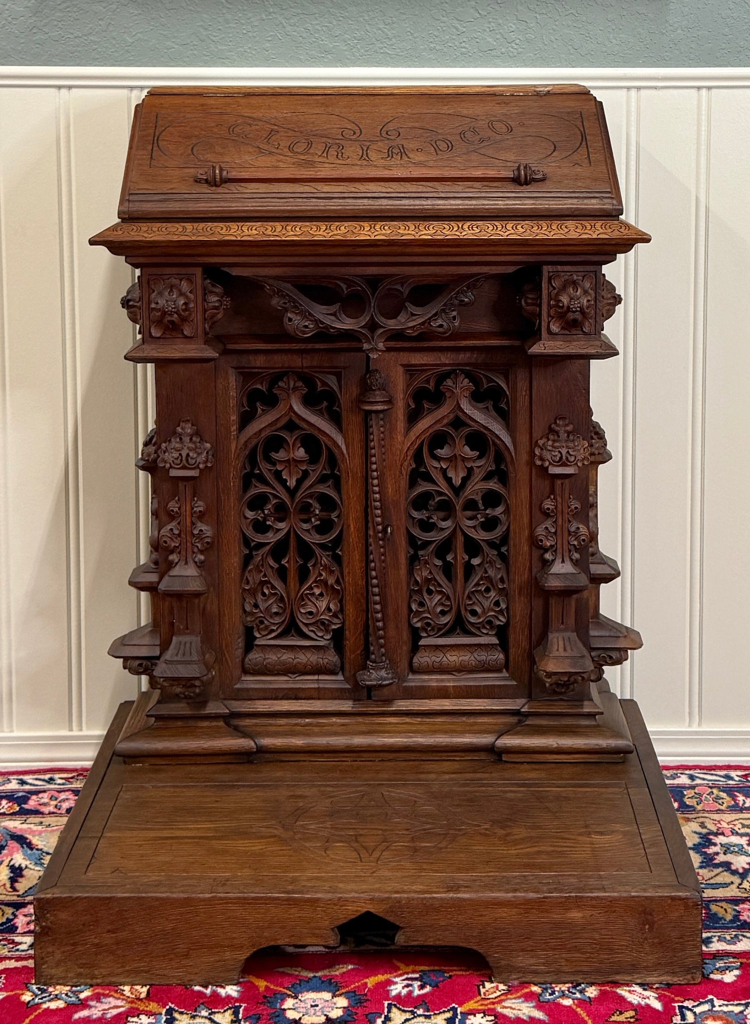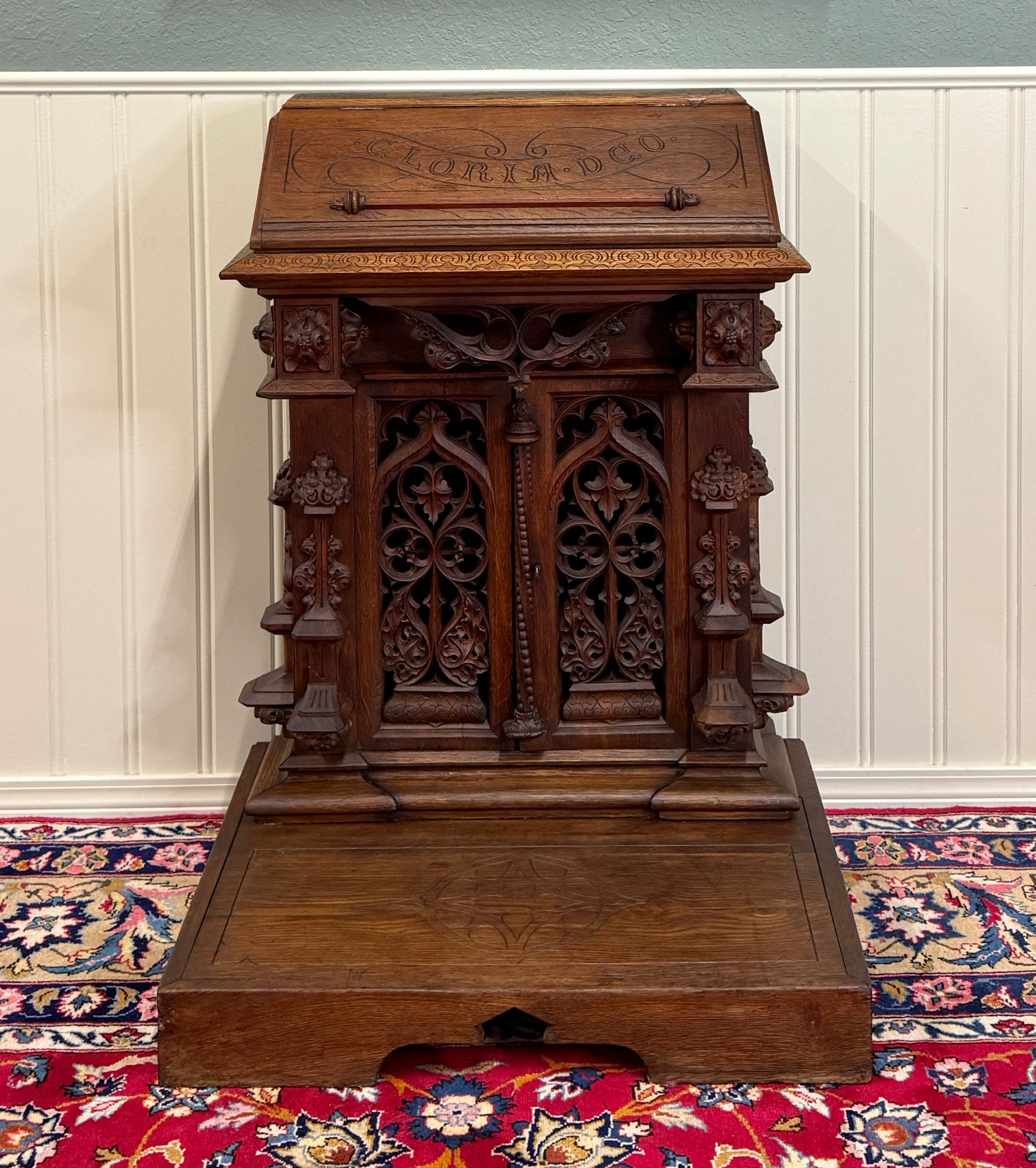 Beautifully carved with tracery and Gothic elements