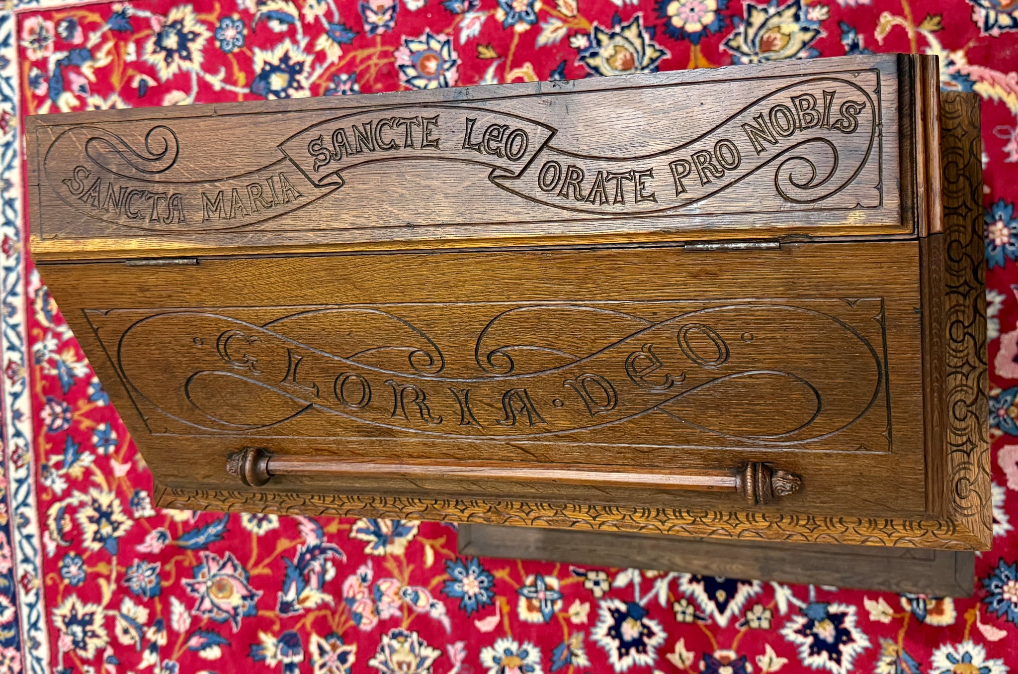 Flat top inscribed "Sancta Maria Sancte Leo Orate pro Nobis (Holy Mary, Saint Leo, pray for us)," over slant-front door inscribed "Gloria Deo (Glory to God),
