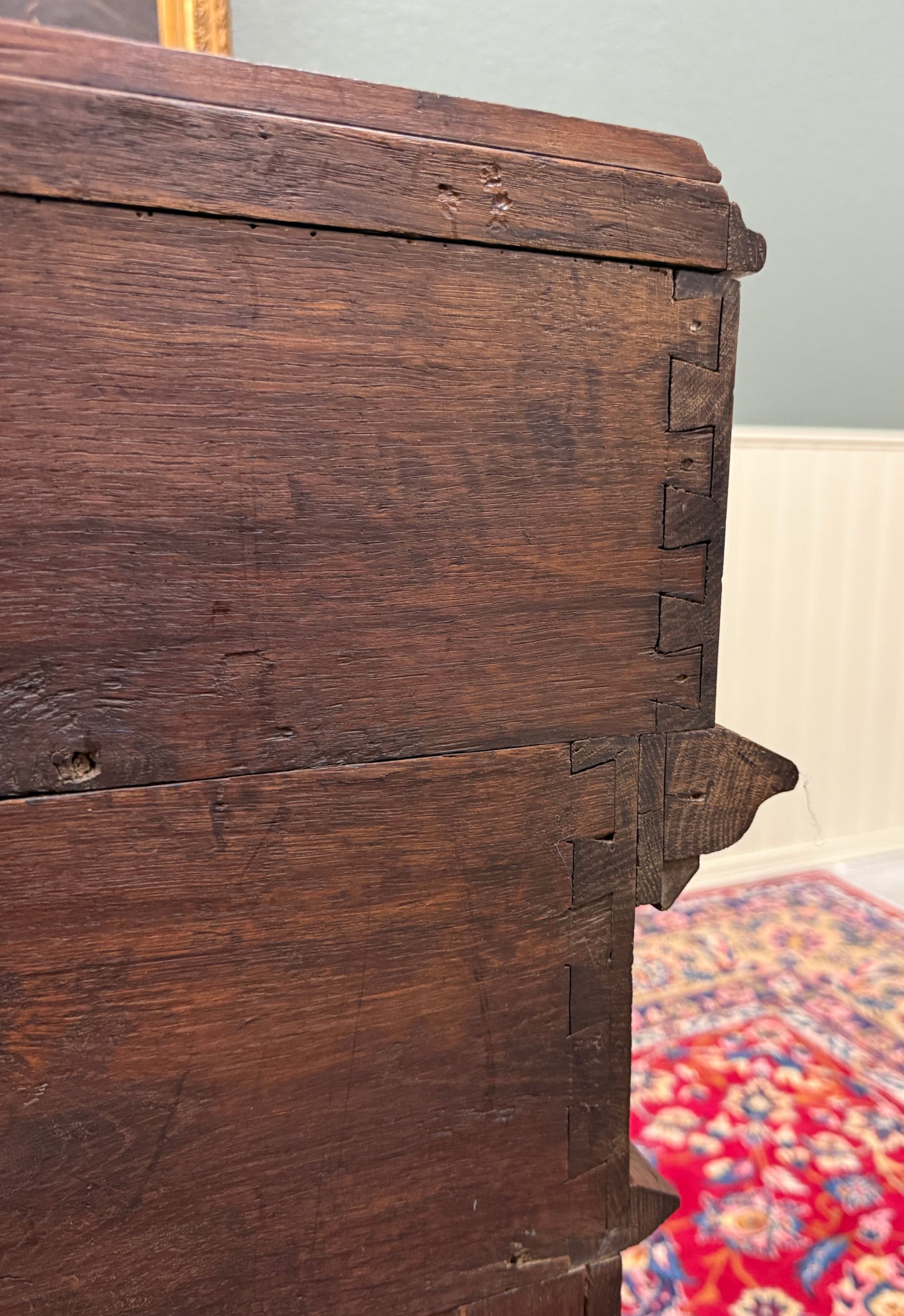 Exceptionally carvings and exposed dovetail joints on the back.