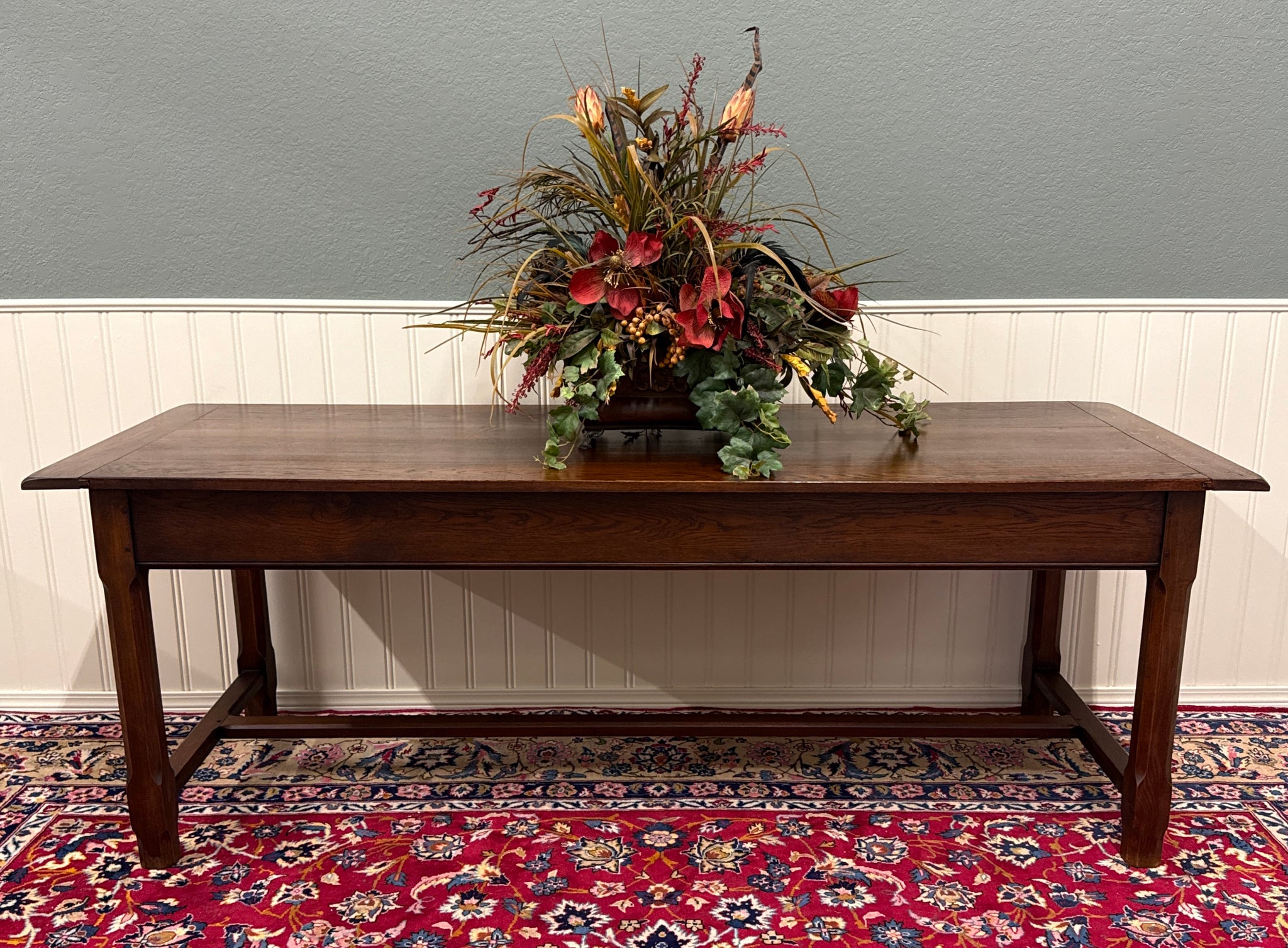 This table has "the look"~~one of our most often requested items~~hard to find baker's farm table with drawer~~pegged construction with "H" stretcher