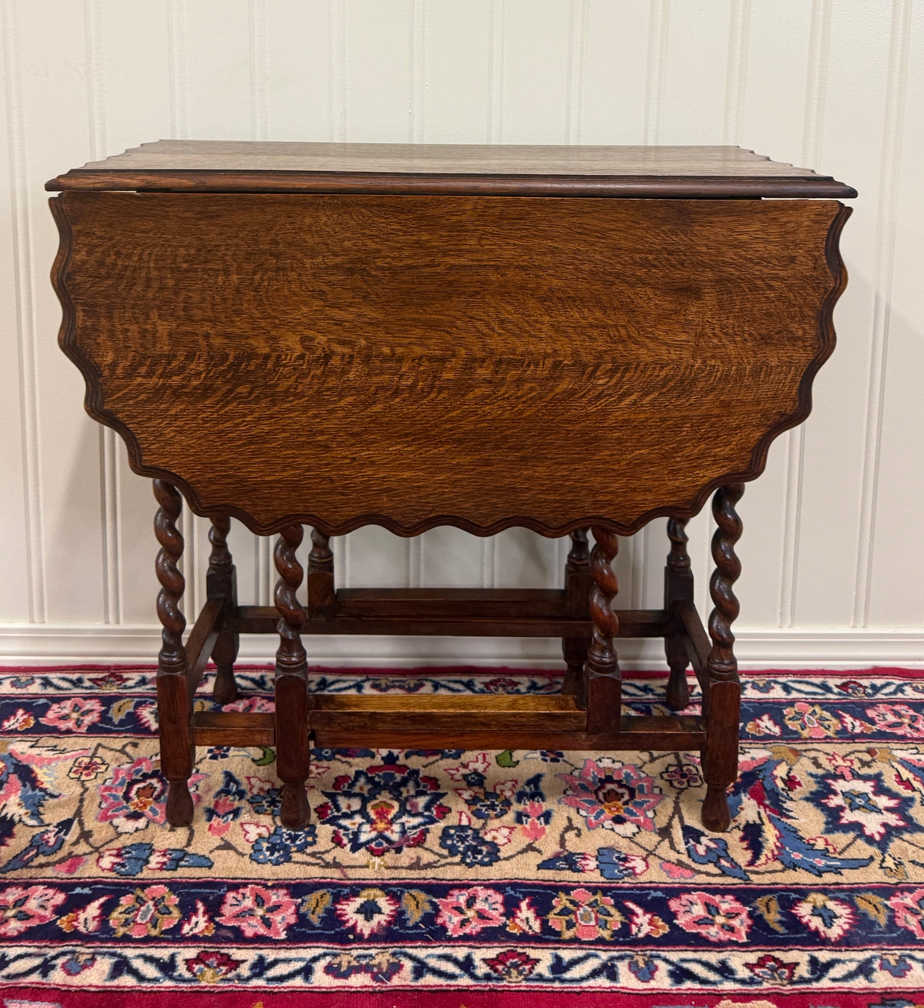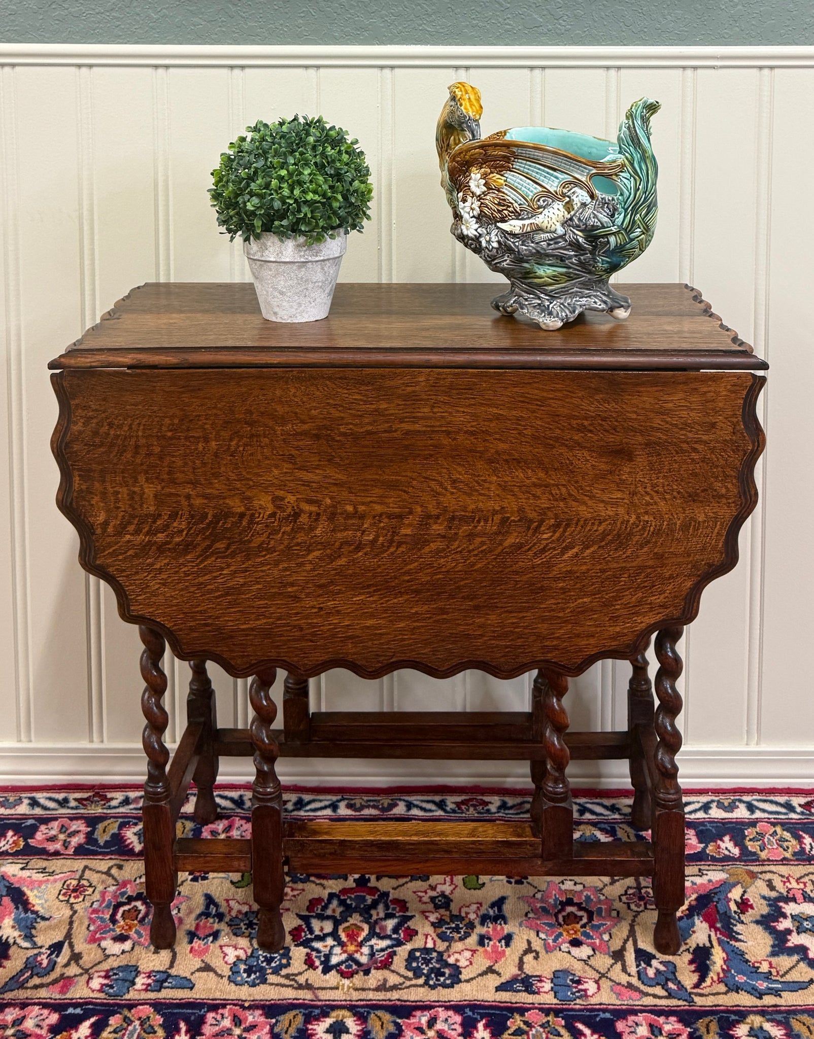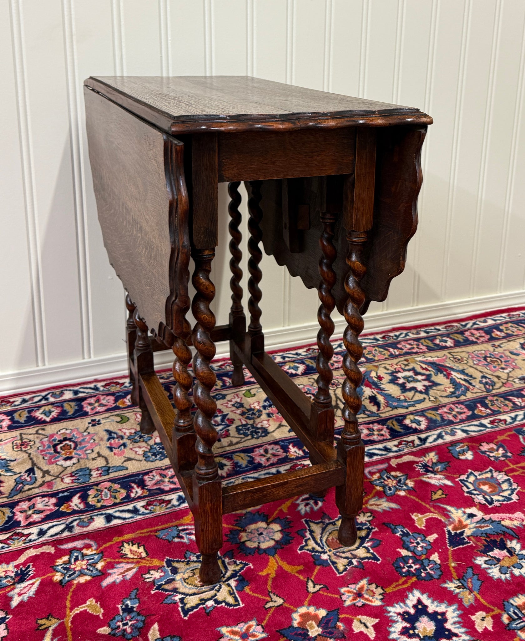 Always in high demandSolid and sturdy with very nice oak patinaVersatile size28.5" tall x 30" wide x 14.5" deep (with both leaves down)Leaves add an additional 13.75 inches eachGreat for use as an end table, tea table, sofa table, lamp table or small nightstandAdd a touch of English charm to your home or office today~~Direct from England~~c. 1930sSHIPPING: This item requires professional packaging and shipping via blanket wrap ("white glove") delivery. All items are fully insured and will be delivered and set up inside your home or office. This service typically takes 4-6 weeks, depending on your location. Pick up is also available at our location in Tyler, Texas, in lieu of shipping.