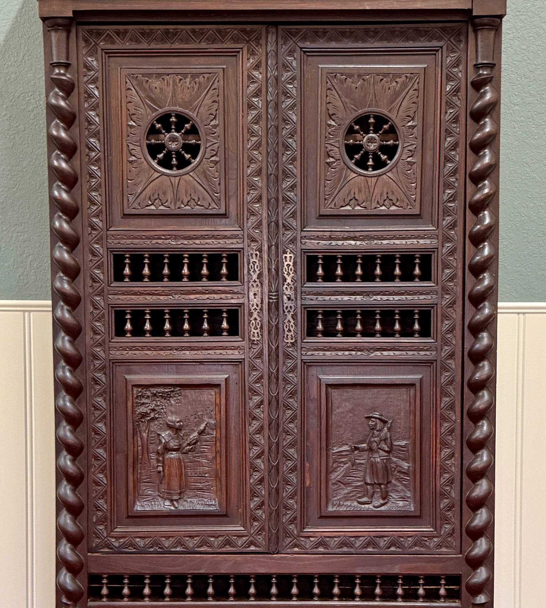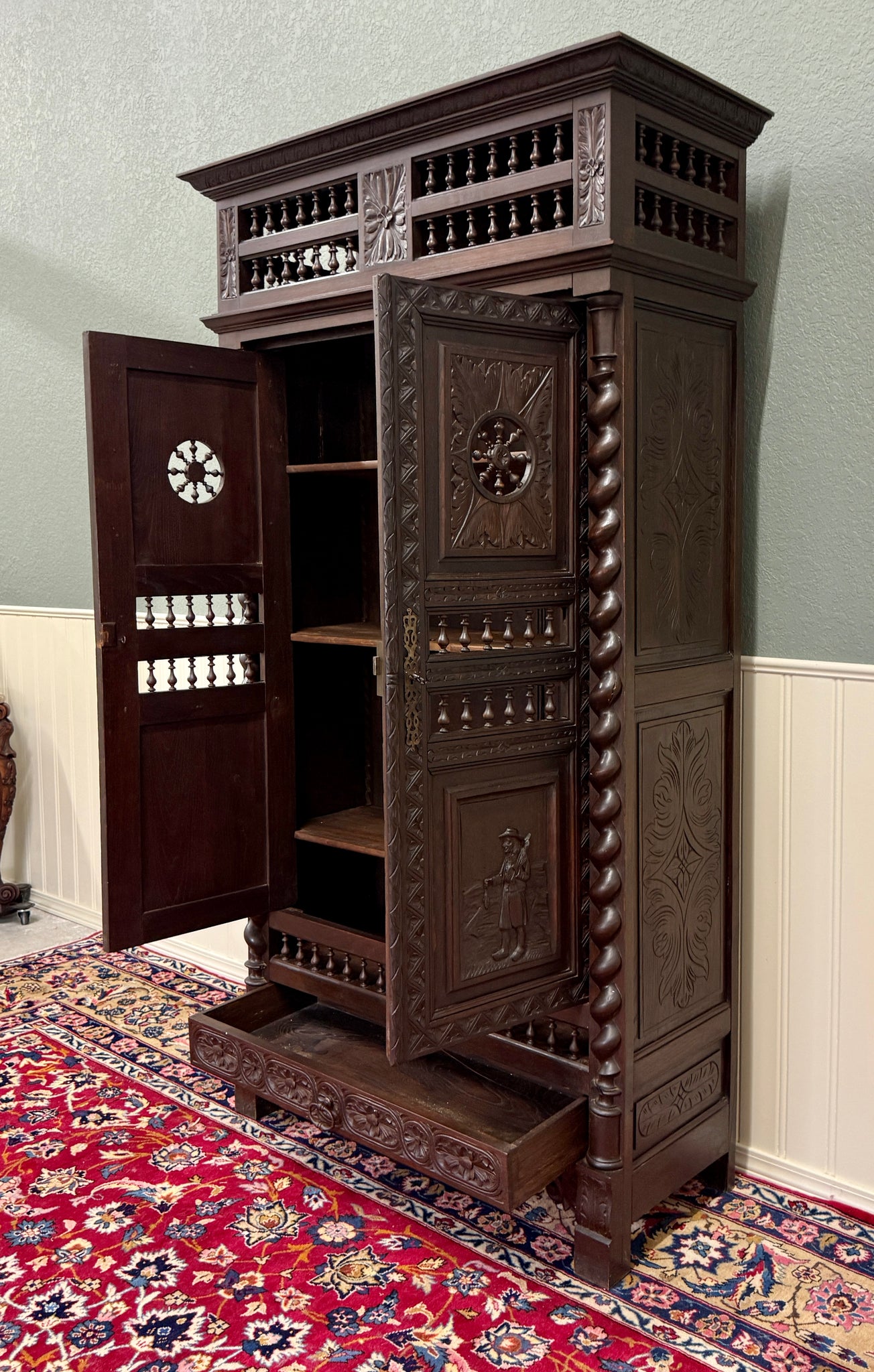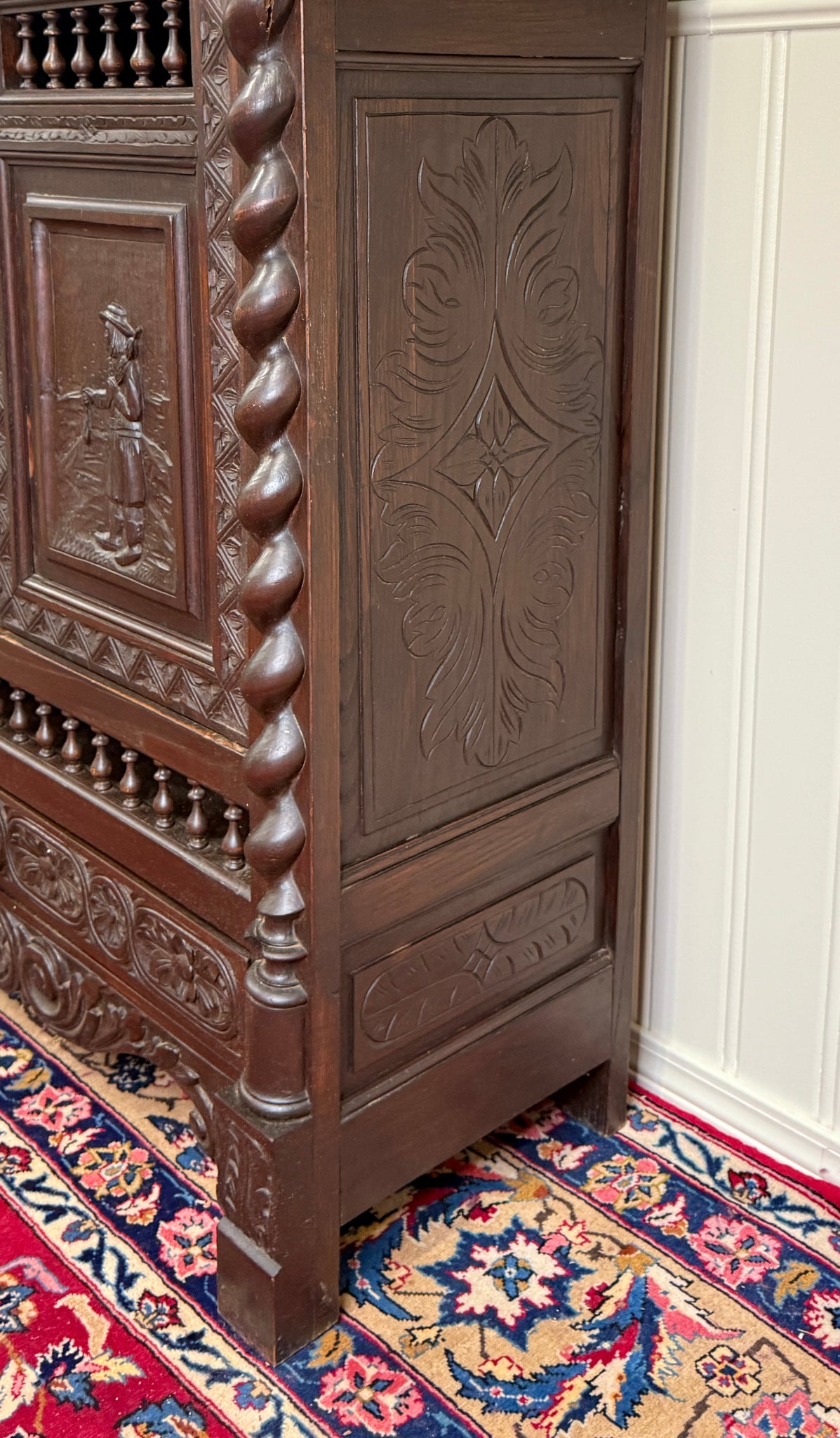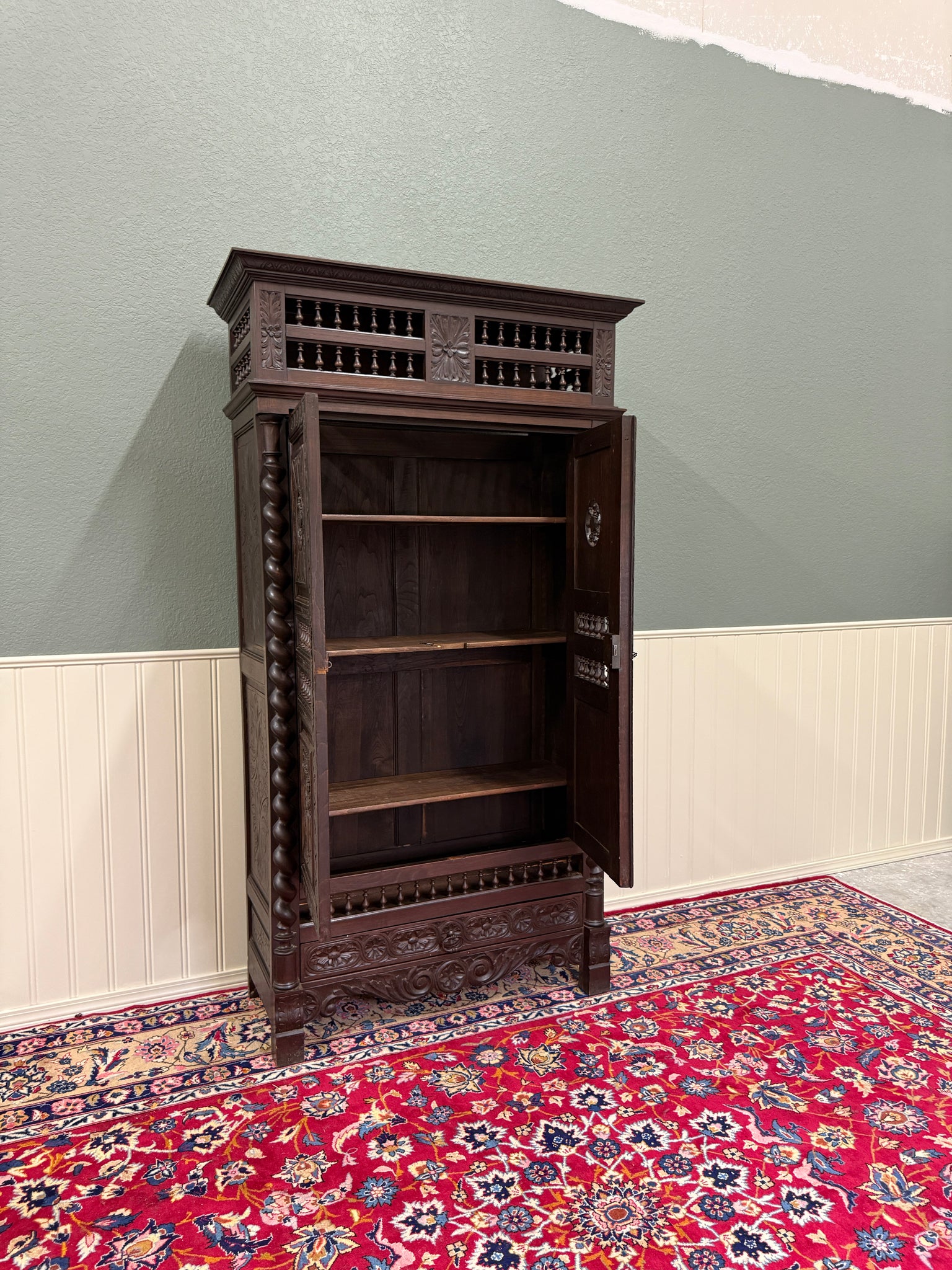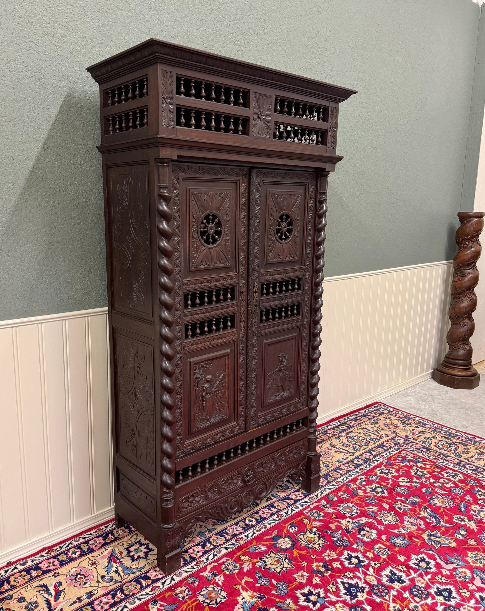Beautifully Carved Antique French Chestnut Breton Double Door Bookcase, Armoire Bonnetiere, Linen Cabinet Barley Twist with Drawer~~c. 1890s